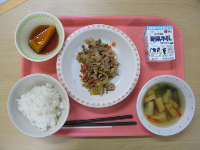2月24日(火)は、牛乳、ごはん、豚肉とピーマンのピリ辛炒め、南瓜の甘煮、すまし汁、でした。