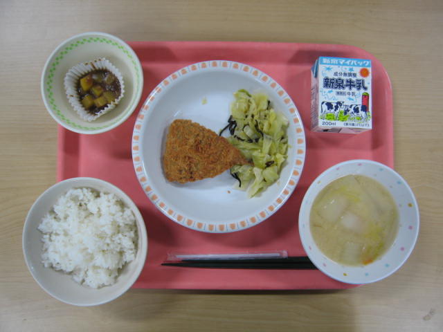 2月25日(水)は、牛乳、ごはん、アジフライ、きゃべつの塩昆布和え、みそ汁、鬼まんじゅう、でした。