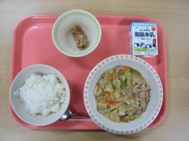 2月27日(金)は、牛乳、ごはん、八宝菜、ちくわの磯辺揚げ、でした。