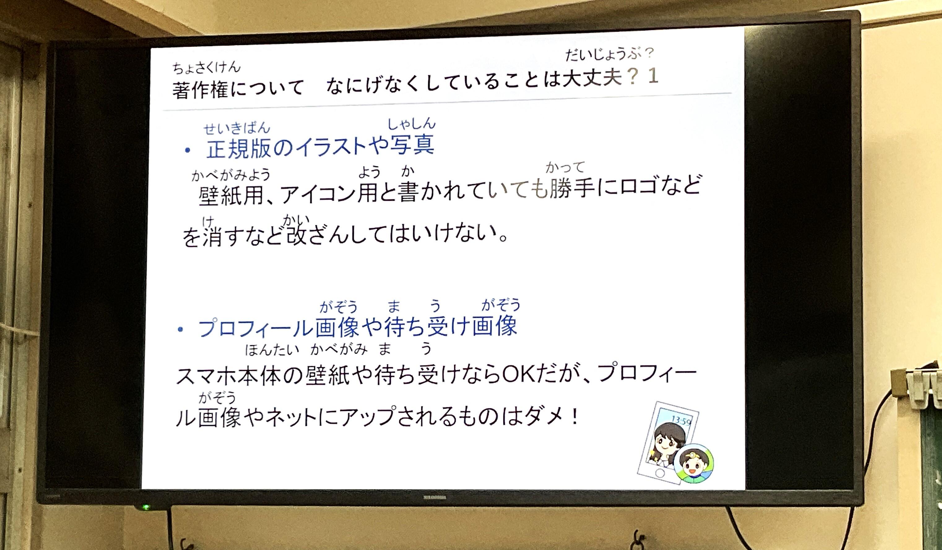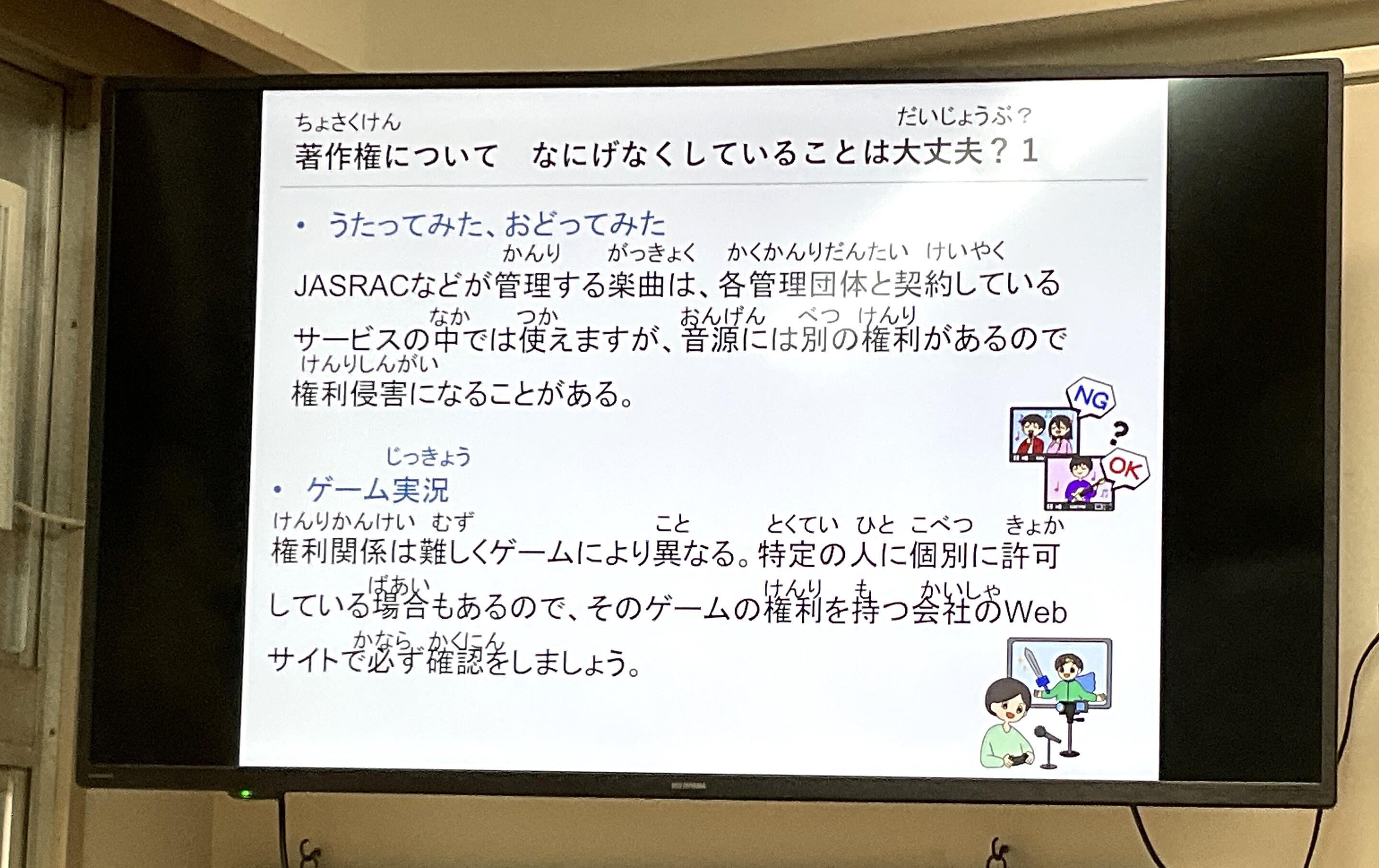 2月10日(火)3時間め、2年生で人権学習(SNS)を行いました。「人の権利を侵害していないか」というテーマで、インターネット上での著作権を侵害するような不適切な投稿をしていないか、違法アップロードや海賊版などを閲覧していないかなどをスライドや動画を見て学習しました。好きなキャラクターをSNSのプロフィールなどに使用するなど、つい行ってしまいがちな行動も著作権の侵害にあたるということも確認しました。気を付けなければならないと、子どもたちもしっかりと聞いていました。