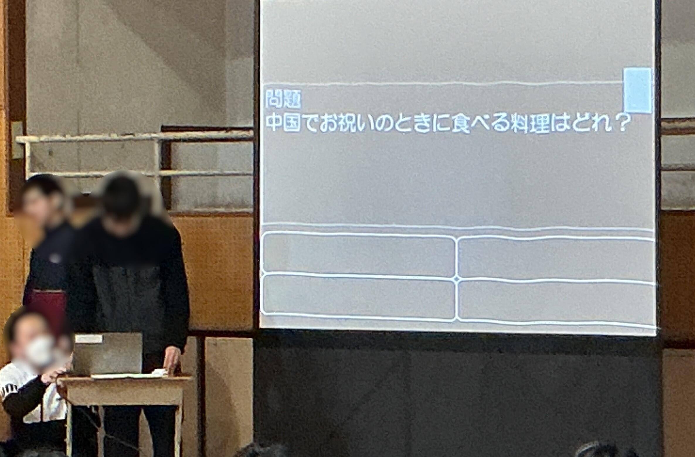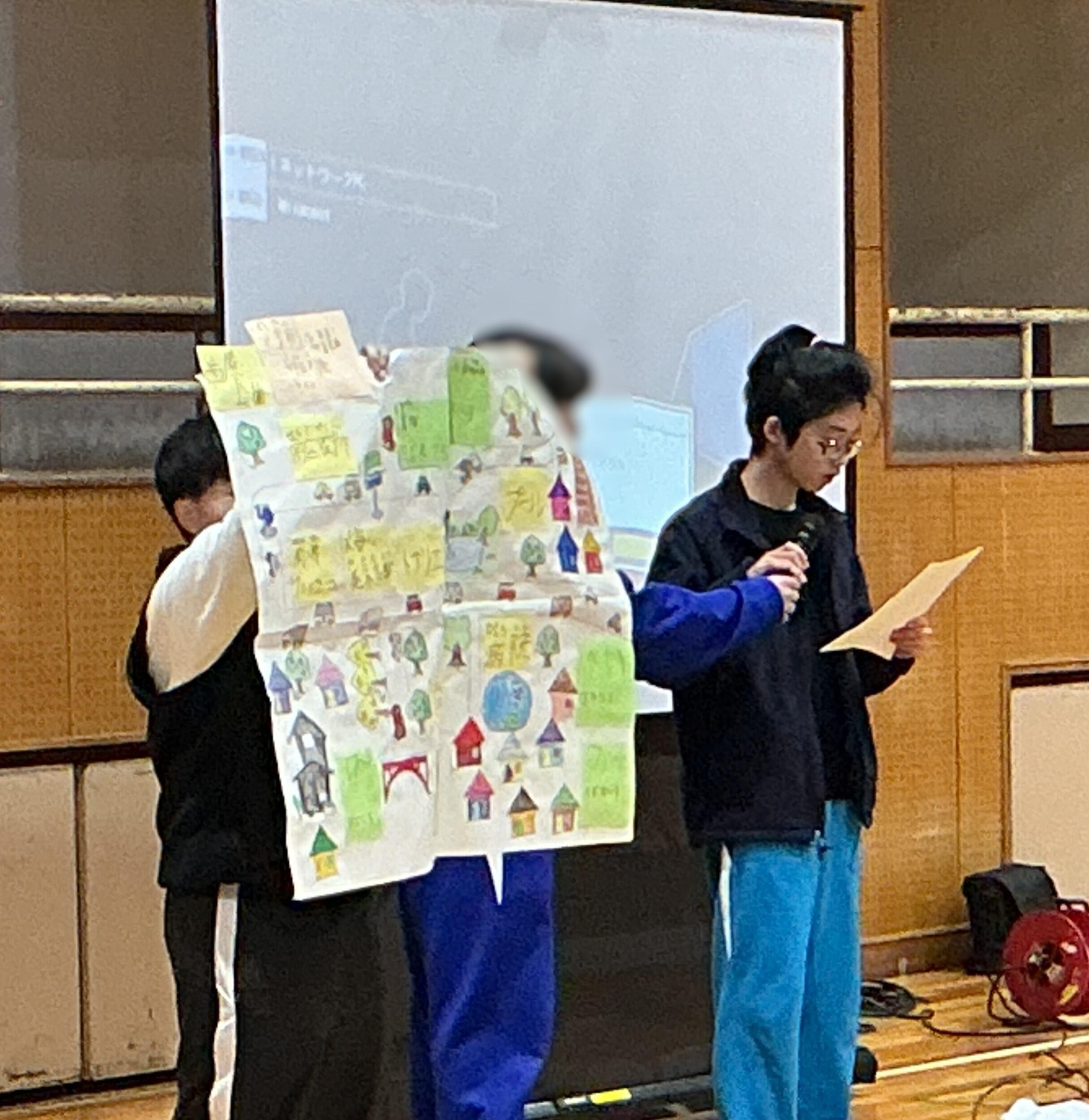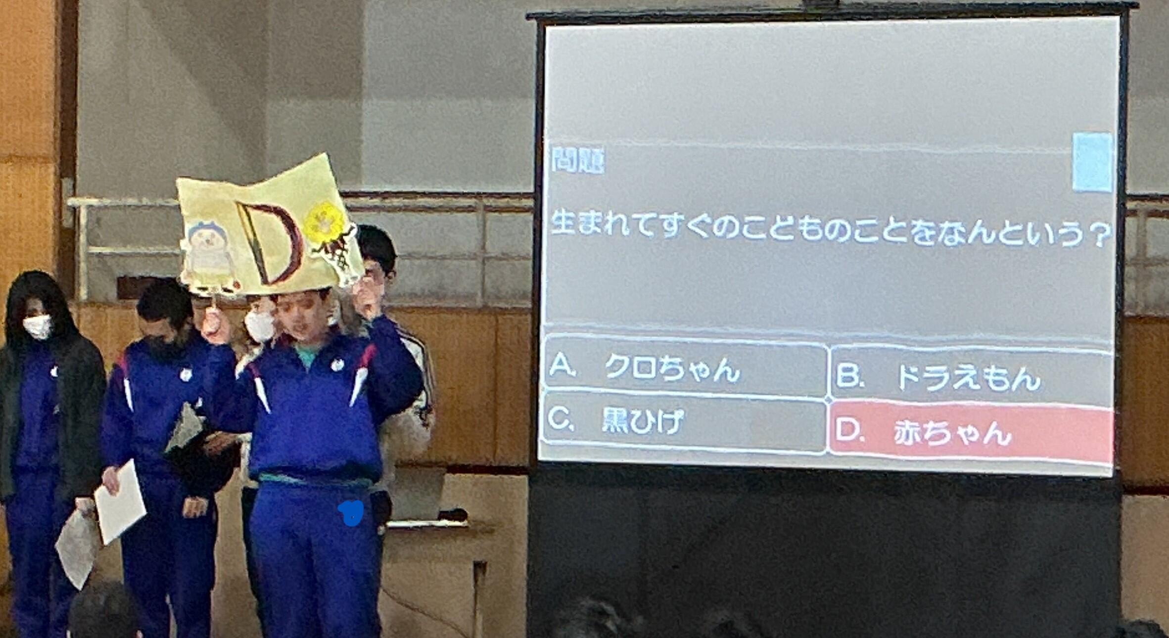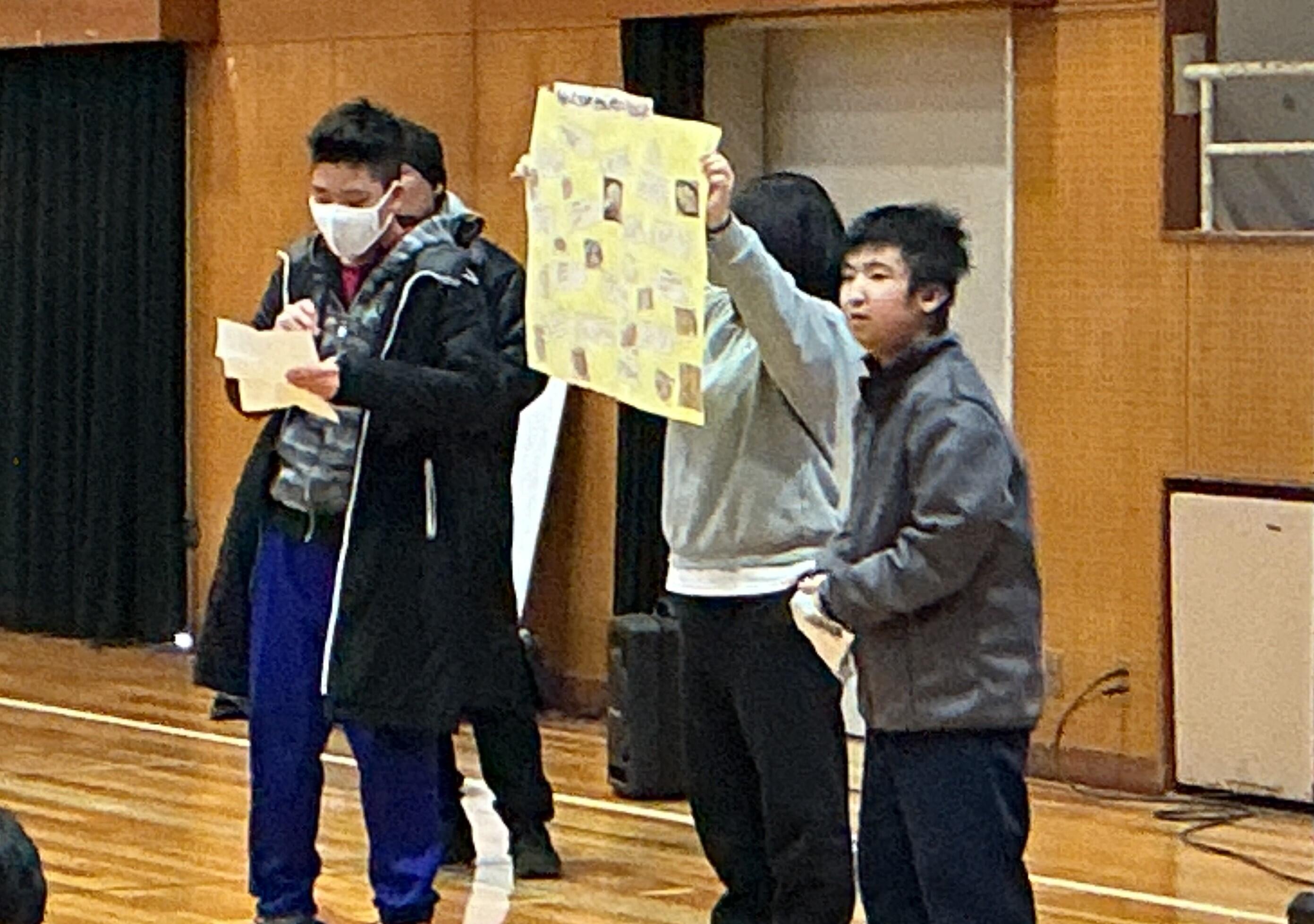 2月13日(金)5時間め、総合的な探求の時間の成果発表会を行いました。1年「健康・福祉」2年「環境・防災」3年「文化・国際・共生」をテーマに1年間学習してきたことをクラスごとにまとめ、1年生、2年生、3年生の順番で発表しました。掲示物を作ったりスライドを作成したり、クイズ形式にしたり実演を交えたりとバラエティーに富んだ発表でした。