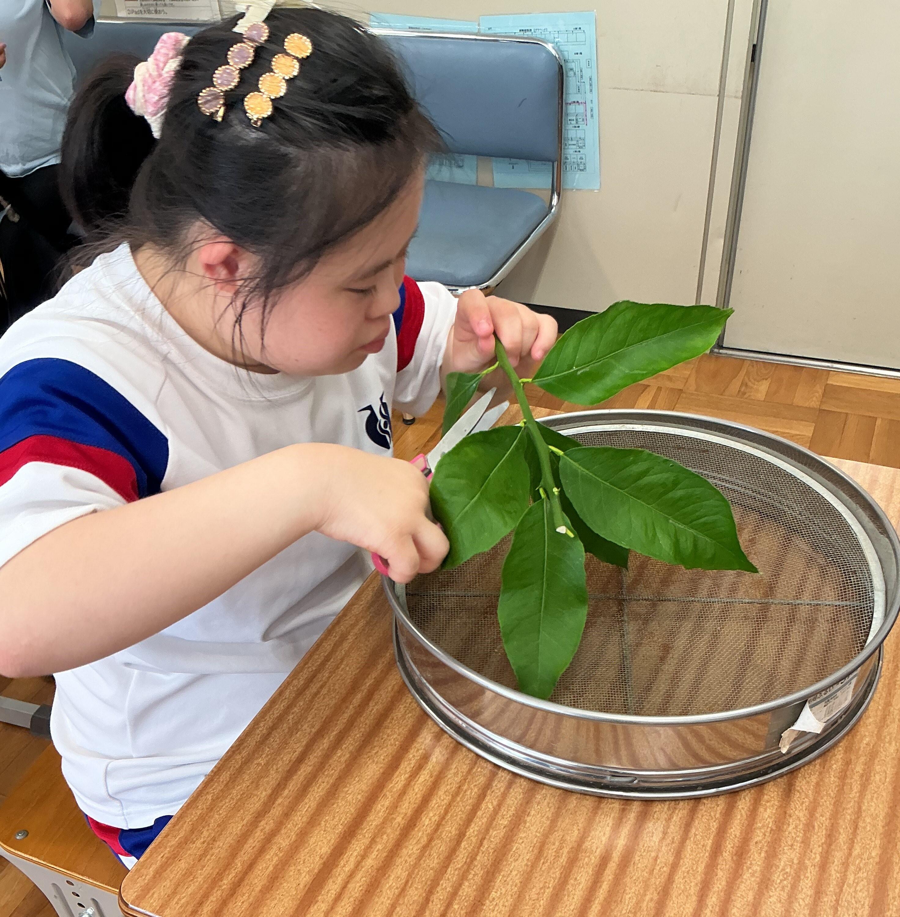 9月5日(金)の5限に、2年生の総合の時間でレモンの枝葉の活用方法について考えました。1学期に各クラス枝葉の活用方法について調べ、考えたものをもとに、実際に枝葉に触れ、刻んでみたり、乾燥してみたりと加工してみました。クラス中にレモンの良い香りに包まれていました。レモンのトゲの威力に驚いたり、袋に入れてにおい袋を作ってみたりとクラスごとで様々な取り組みを行っていました。これから少しずつ、レモンの加工を進めていくことができたらと思います。