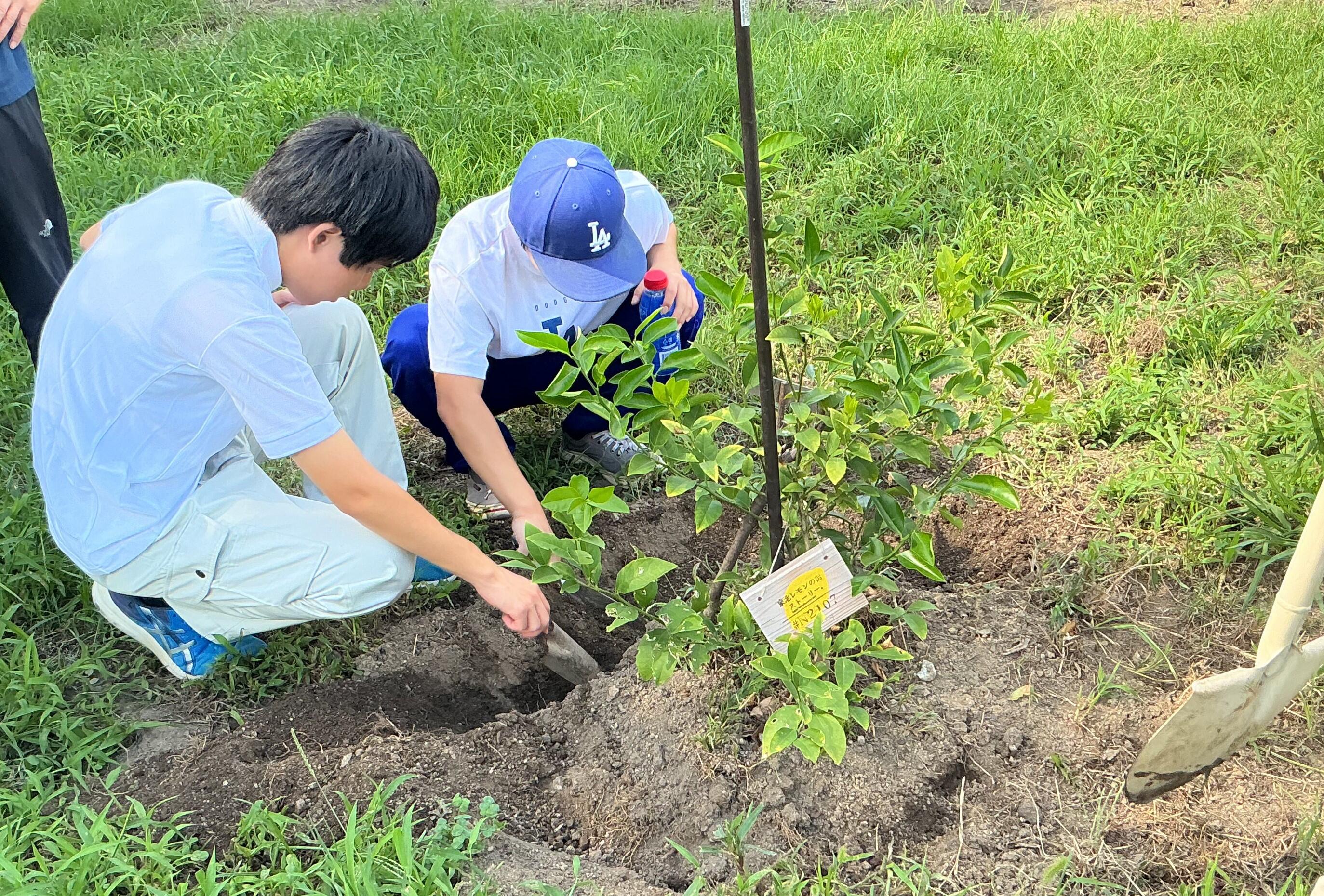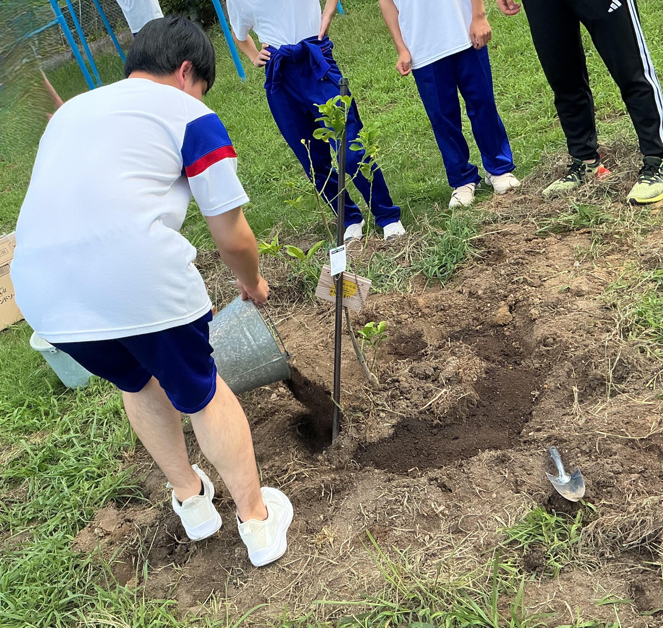 レモンの根は枝の広がりに合わせて地中で広がっているので、枝葉の先と同じくらいの大きさの同心円上に地面を掘り起こし、堆肥を混ぜ込み、水やりを行いました。スムーズに施肥ができるよう、事前に園芸の時間に園芸班のメンバーが堆肥と鶏糞を混ぜ合わせ、レモンの周りの雑草を抜き、軽く地面を掘り起こしておいてくれました。それでも施肥の際には地面が固く、どのクラスもとても苦労をしていましたが、友だちと協力して取り組んでいました。