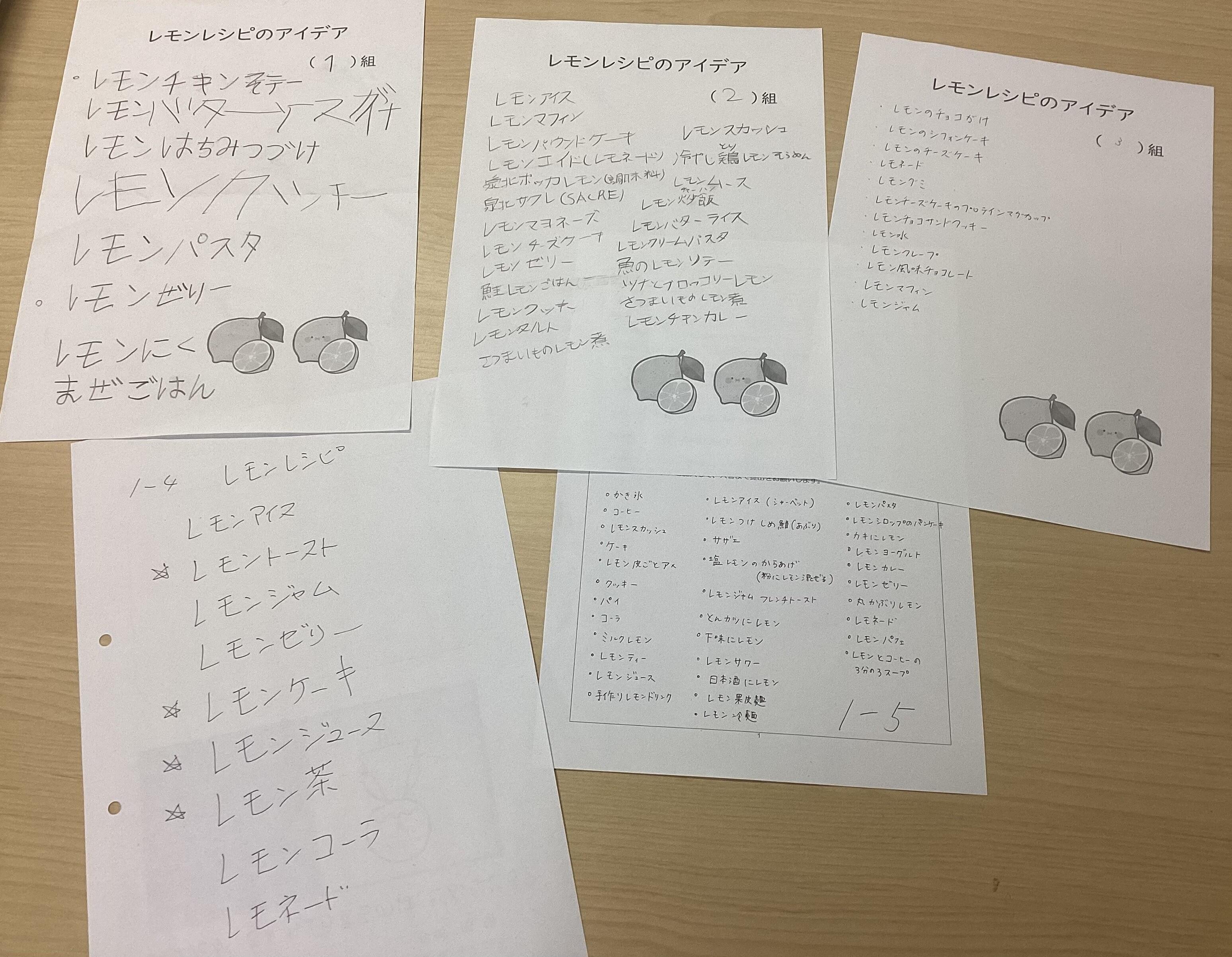 10月3日(金)5限、1年生の総合の時間に「健康」の観点からレモンを活用したレシピを調べる学習を行いました。各クラスたくさんのレモンレシピを調べ、アイデアを出すことでレモンに対して興味をもち、前向きに取り組んでいました。オリジナルのレシピを考えてくれた生徒もおり、レモンのキャラクターである「レモネ」をイメージした「レモネモチーフレモネード」のデザインを描いてくれました。底に青いゼリーを入れたレモネード(もしくはレモンスカッシュ)のようです。一度試作してみたいと思います。