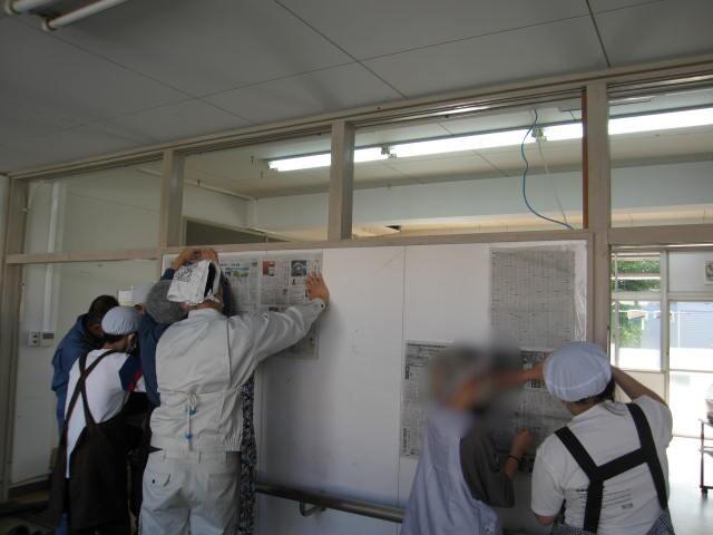 まず2年生「4組工場」メンバーが10月21日(火)にドアやサッシの古くて剥がれてきている塗装をやすり掛けをして剥がす「けれん作業」を行いました。その後23日(木)に縦割り班のメンバーが、ドアや窓枠へのペンキ塗り、サッシにペンキを塗るための下準備として壁を新聞紙で養生する作業を行いました。生徒たちの協力のもと、素敵な調理室に生まれ変わりました。
