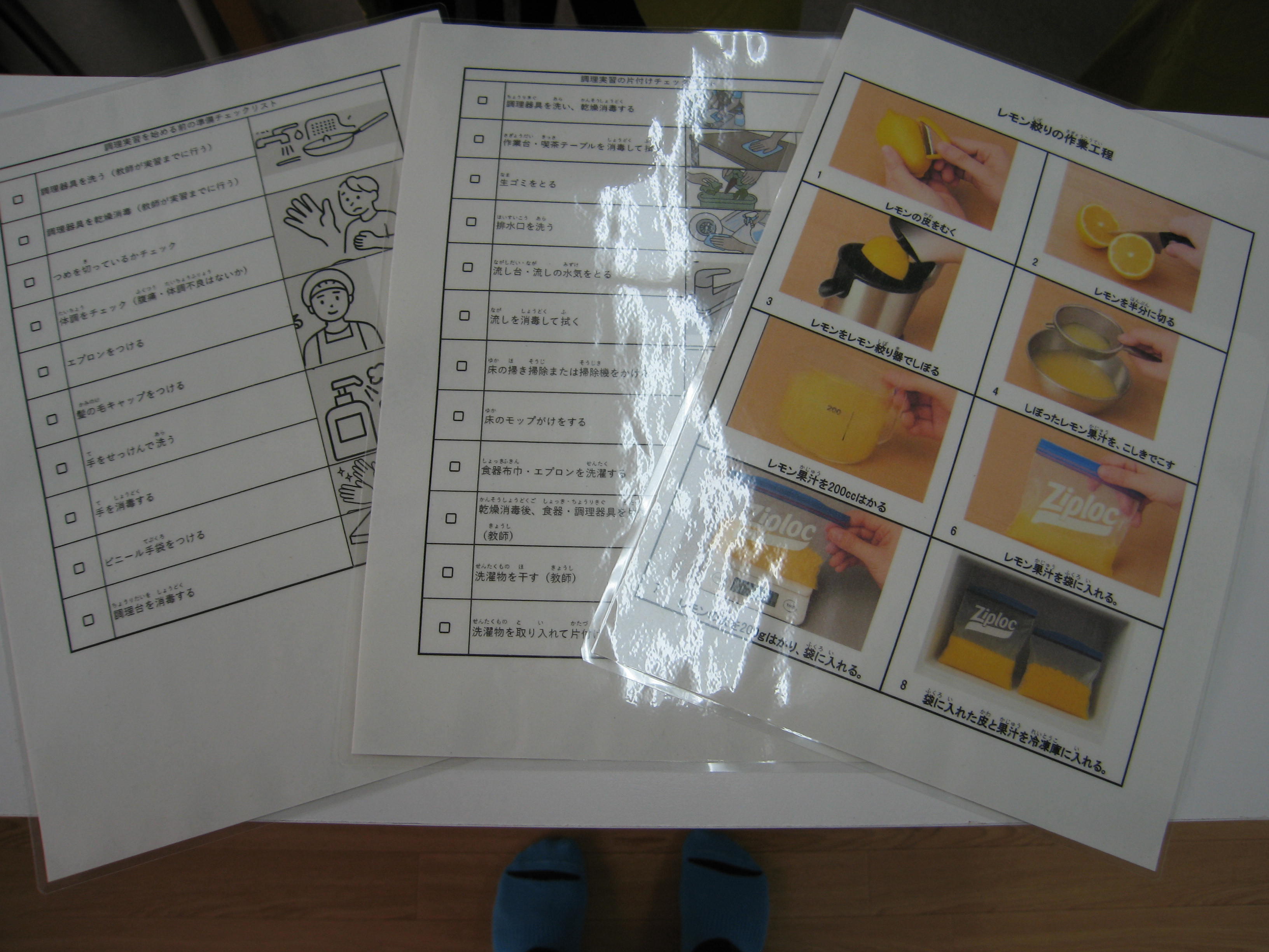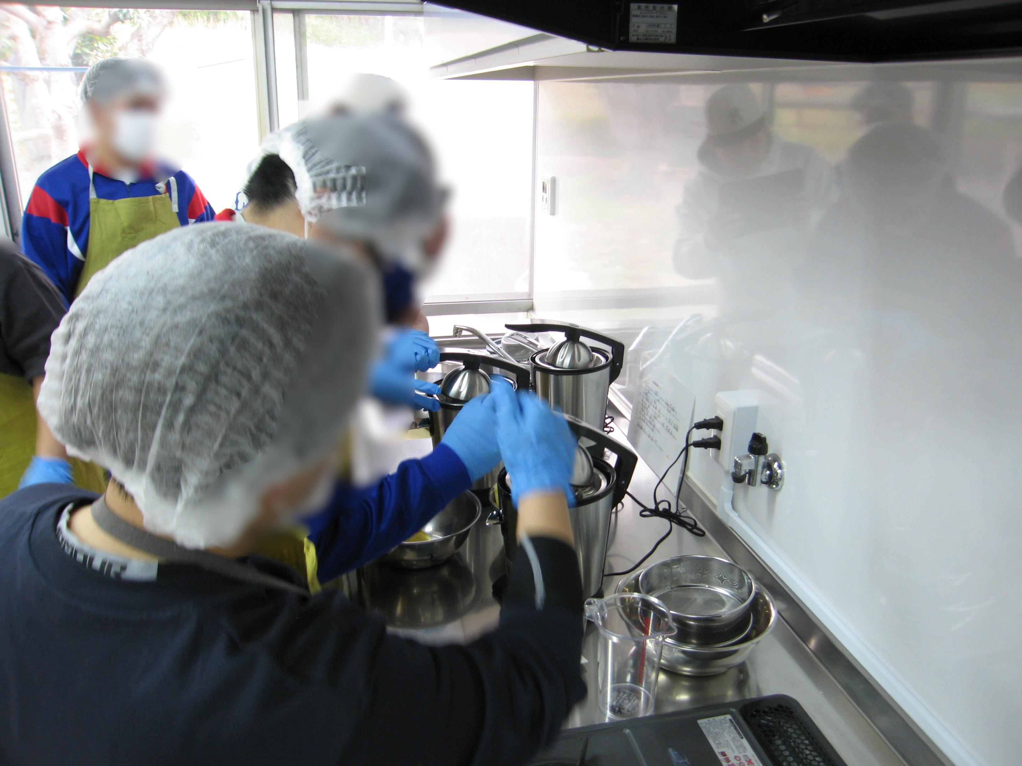 新しくカフェ用に購入した揃いのエプロンを着て、レモンのさわやかな香りに包まれながら、皮をむき、レモン絞り器で絞り、皮と果汁を計量する作業を真剣に取り組んでいました。生徒たちに一番人気は、電動レモン絞り器での作業でした。