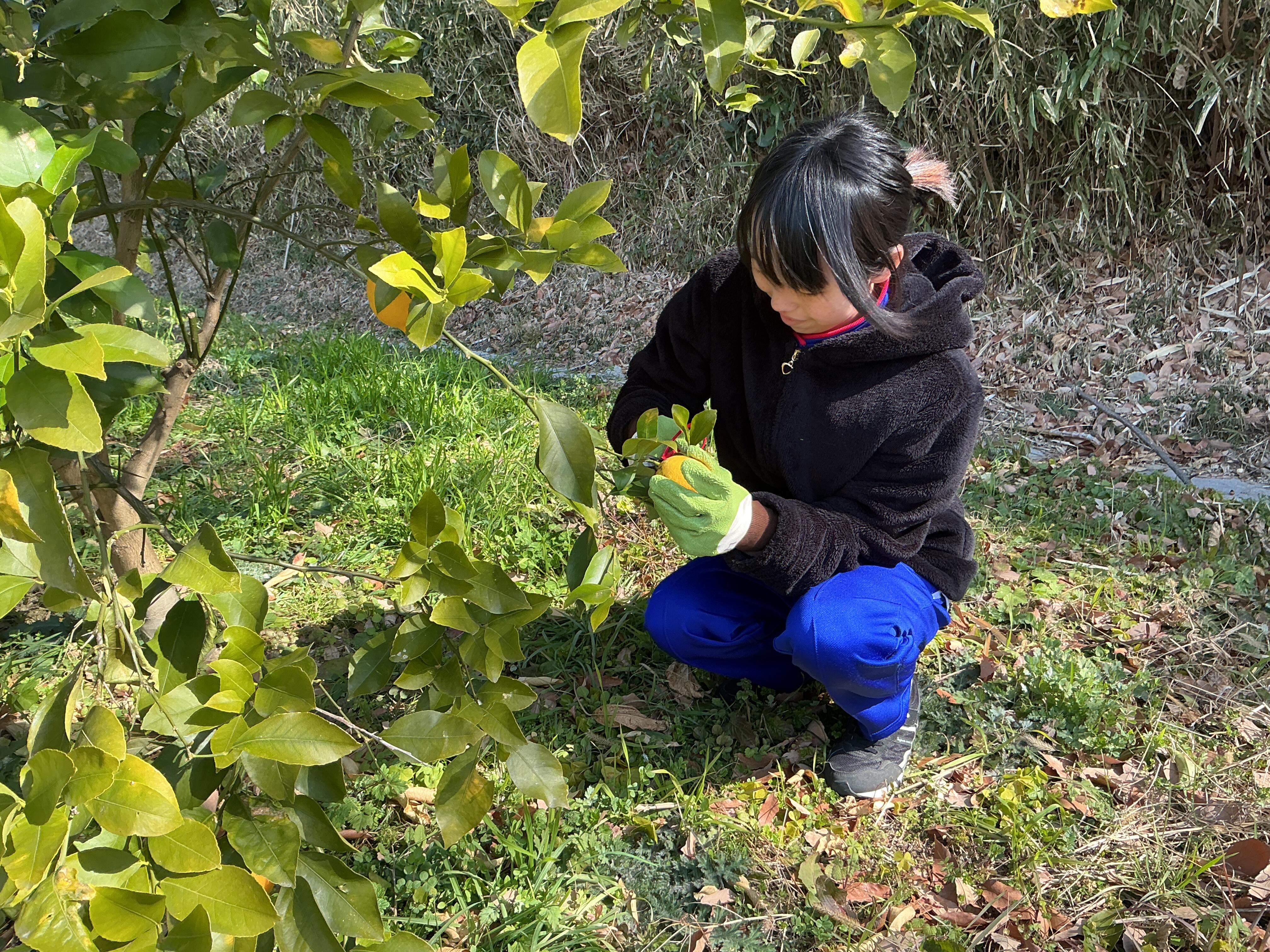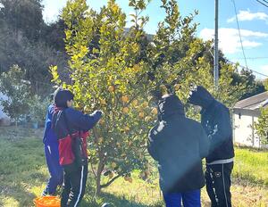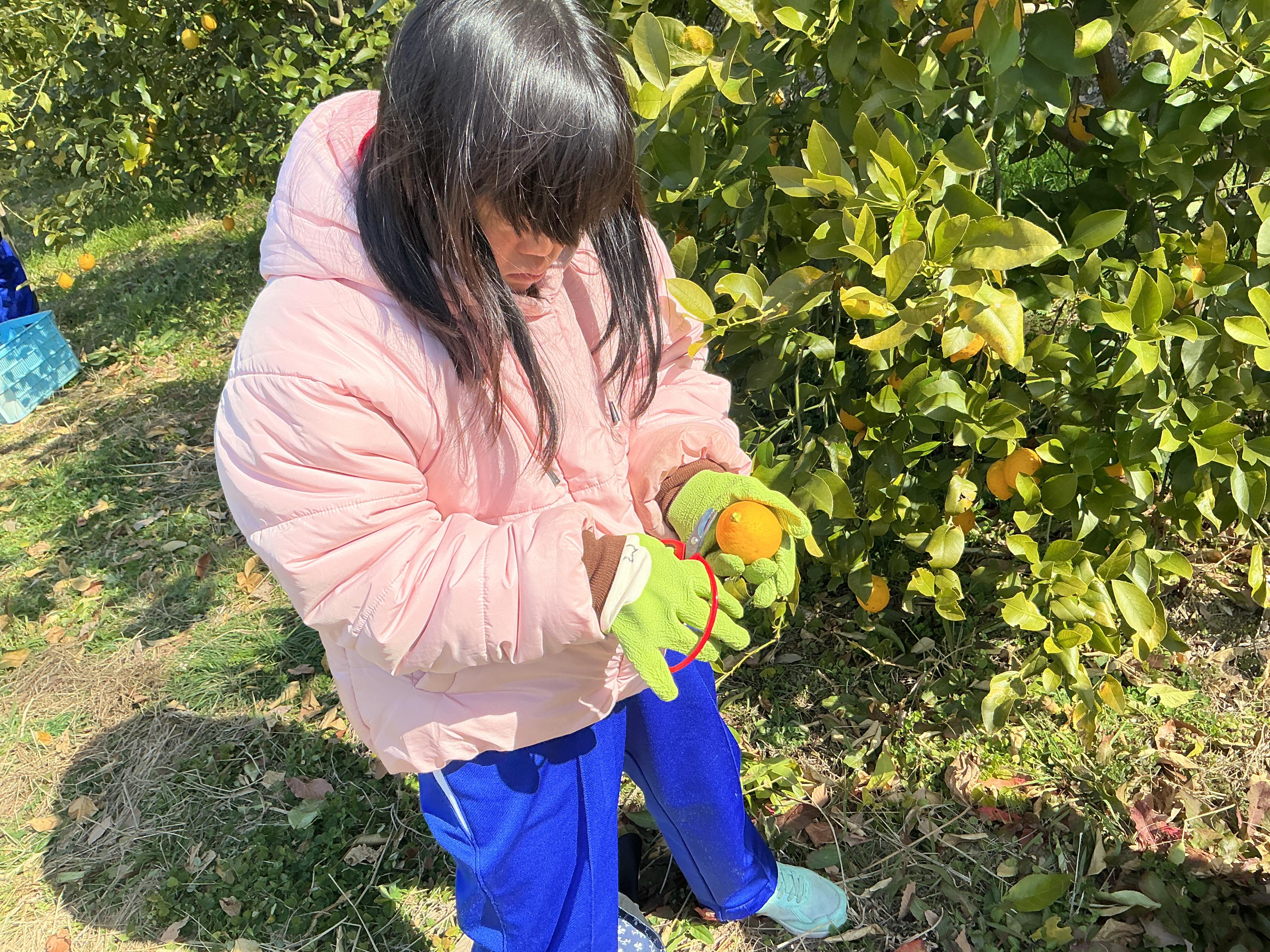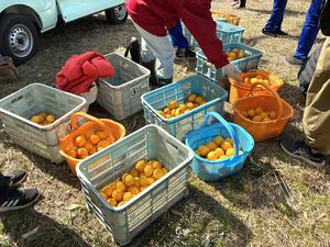 いってみると畑にはレモンが鈴なり!本校のレモンの木にもこんなにたくさんの実がなるといいねと話しながら収穫しました。レモンの種類やレモン同士が傷つかないように「二度切り」をすることなど、教えてもらったことに注意しながらみんなで積極的に収穫し、全員で約100㎏のレモンを収穫しました。お土産にジャンボレモンとリスボンのレモンを2つずついただきました。