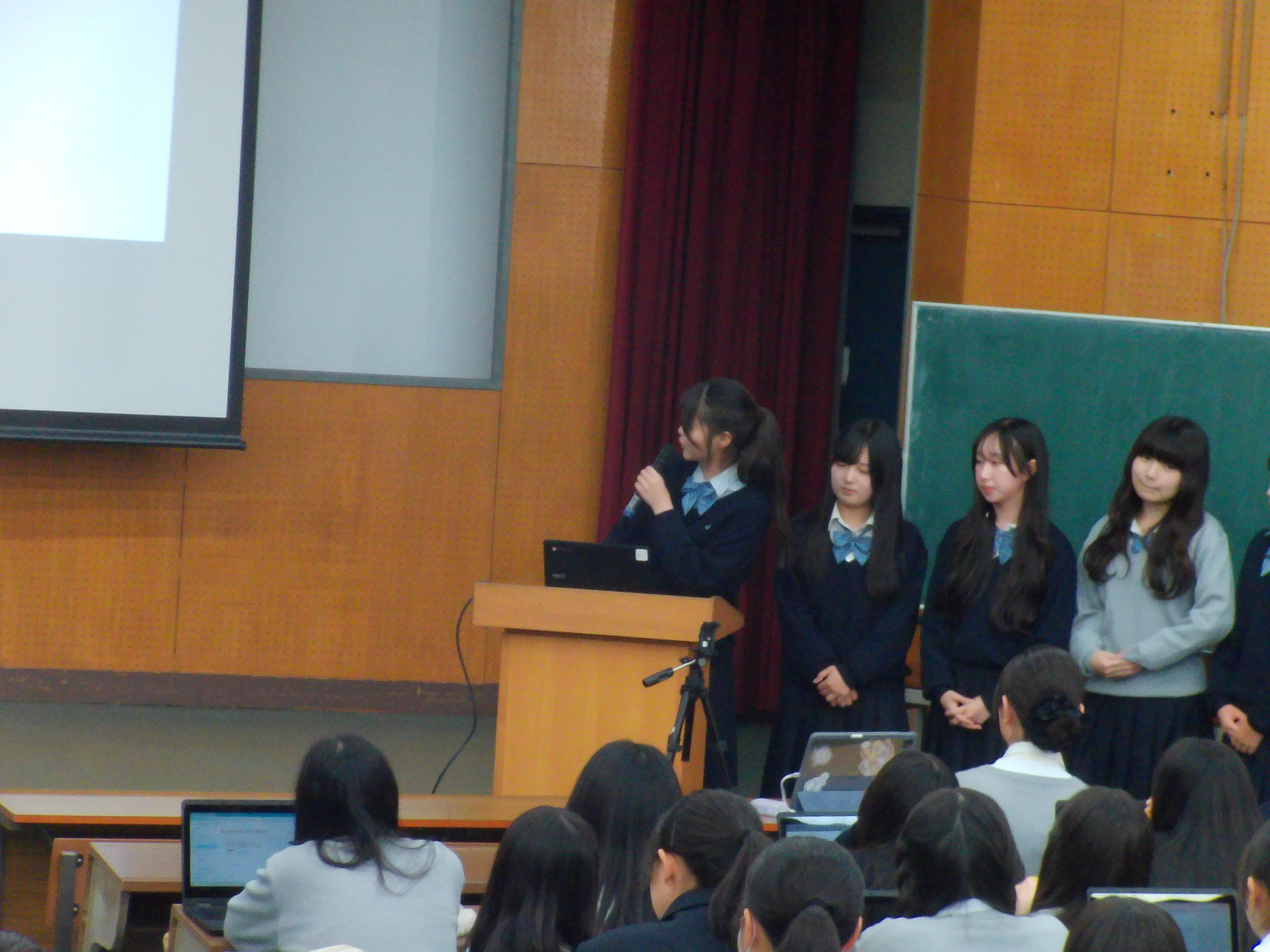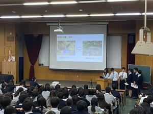 また、今年は3年生の総合科学科の代表班も特別に発表しました。総合科学科では、自分たちの疑問に見合ったことの仮説を立て、その仮説を検証するための実験をし考察を行っています。プレゼンを見た2年生にとっては、とても勉強になる内容でした。