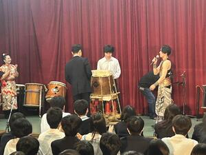 講演は、迫力ある和太鼓の演奏からスタート。太鼓の力強い音が視聴覚室に響き渡り、生徒たちはその迫力に圧倒されながらも、演奏者の思いに耳を傾けました。