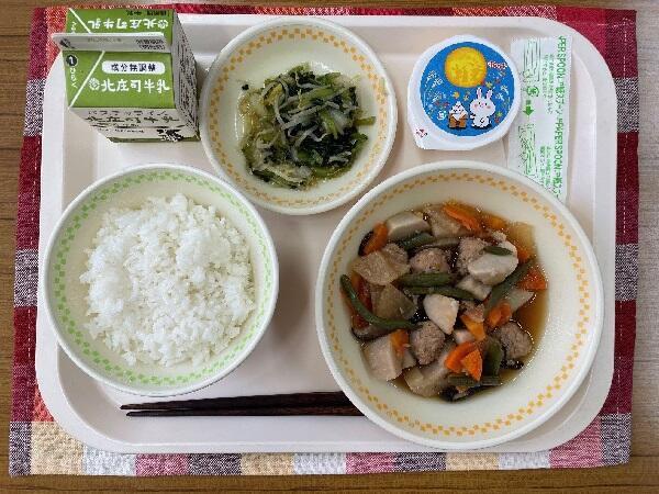 さて、本日の給食の献立です。 今日は、「中秋の名月」。お月見にちなんで、「十五夜デザート」付きです。