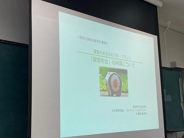 11月14日(金)に保護者対象に「自立懇談会」を実施しました。「障害のある方のマネープランと『障害年金』の申請」と題して、社会保険労務士・ファイナンシャルプランナーの久保田あきみ先生に講師としてお越しいただきました。