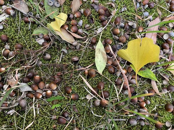 校庭の片隅にかわいいドングリの実がたくさん落ちていました。そろそろ秋から冬の季節に移り変わる頃です。