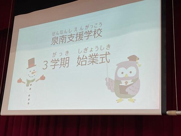小学部、中学部、高等部の児童生徒が体育館に集合し、とても元気よく、新年のごあいさつをしていました。そして、校歌も、笑顔いっぱい!歌っていました。3学期がスタートしました。クラスのみんなや先生と協力して、いろんなことに、楽しみながら取組んでほしいと思います。みなさんが、しっかり頑張っている姿を見るのを楽しみにしています。