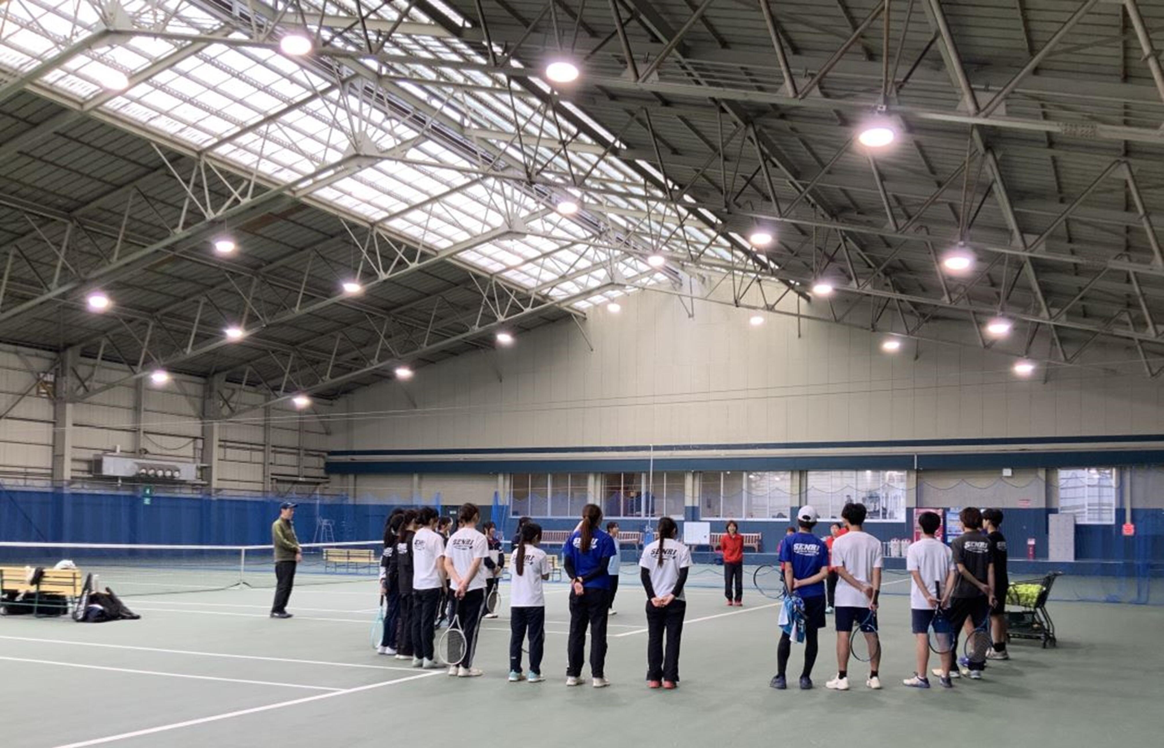 二日目は、雨天のため急遽インドアコートへの変更となってしまったにも関わらず、江坂テニスセンターさんやコーチの方々の柔軟な対応によりとても充実した練習を行うことができました。本当にありがとうございました。この経験を糧に、春の大会や引退試合に向けて一球一球に全力で頑張ろうと思います!
