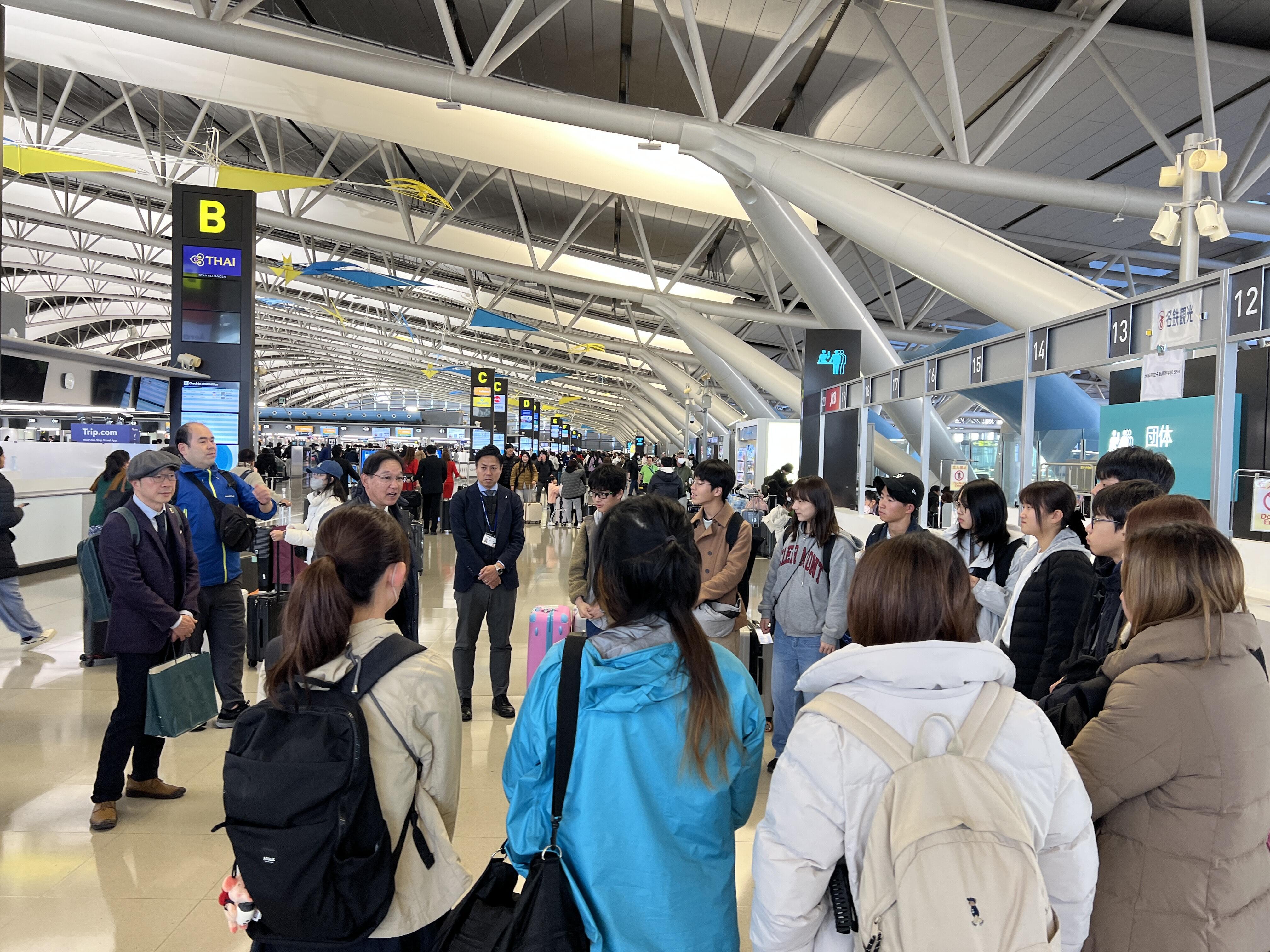 1年生12名、2年生1名の計13名の生徒が台湾に向けて出発します。引率する教員は3名です。現地では高校や大学を訪問し、現地で共同研究を行う予定です。関西国際空港に8時に集合し、出発式を行いました。校長先生による激励のあいさつがありました。10:55出発の飛行機に乗り、台湾に向かいます。