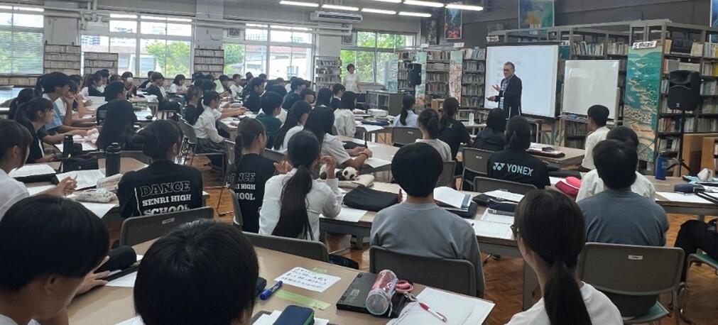 9/4(木)国際文化科1年生探究基礎において、元国連職員で本校5期生の沼田隆一さんによるAll Englishの特別講座を開催しました。テーマは「Negotiations under Multi-cultural Environment」。世界を舞台に活躍する先輩だからこそ語れるリアルな経験と、国際社会で活躍したいと願う後輩たちの熱意が響き合う、貴重な学びの時間となりました。英語も内容も非常に高度な講座にも関わらず、生徒たちは真剣そのもの。活発な質問も出て、終了後の談笑も楽しく、刺激的で素晴らしい一日となりました。沼田先輩には、非常にお忙しい中ご準備いただき、また、当日は2クラスずつ午前・午後の2回講義+個別お話会というタフなスケジュールにも快く応じていただき、心より感謝申し上げます。本日蒔かれた学びの種は、必ず千里生の未来に大きな花を咲かせることでしょう。今後ともどうぞよろしくお願いいたします。(沼田隆一さんは1月にもご来校いただく予定です。千里高校にしかない特別プログラムです。みなさんお楽しみに!)