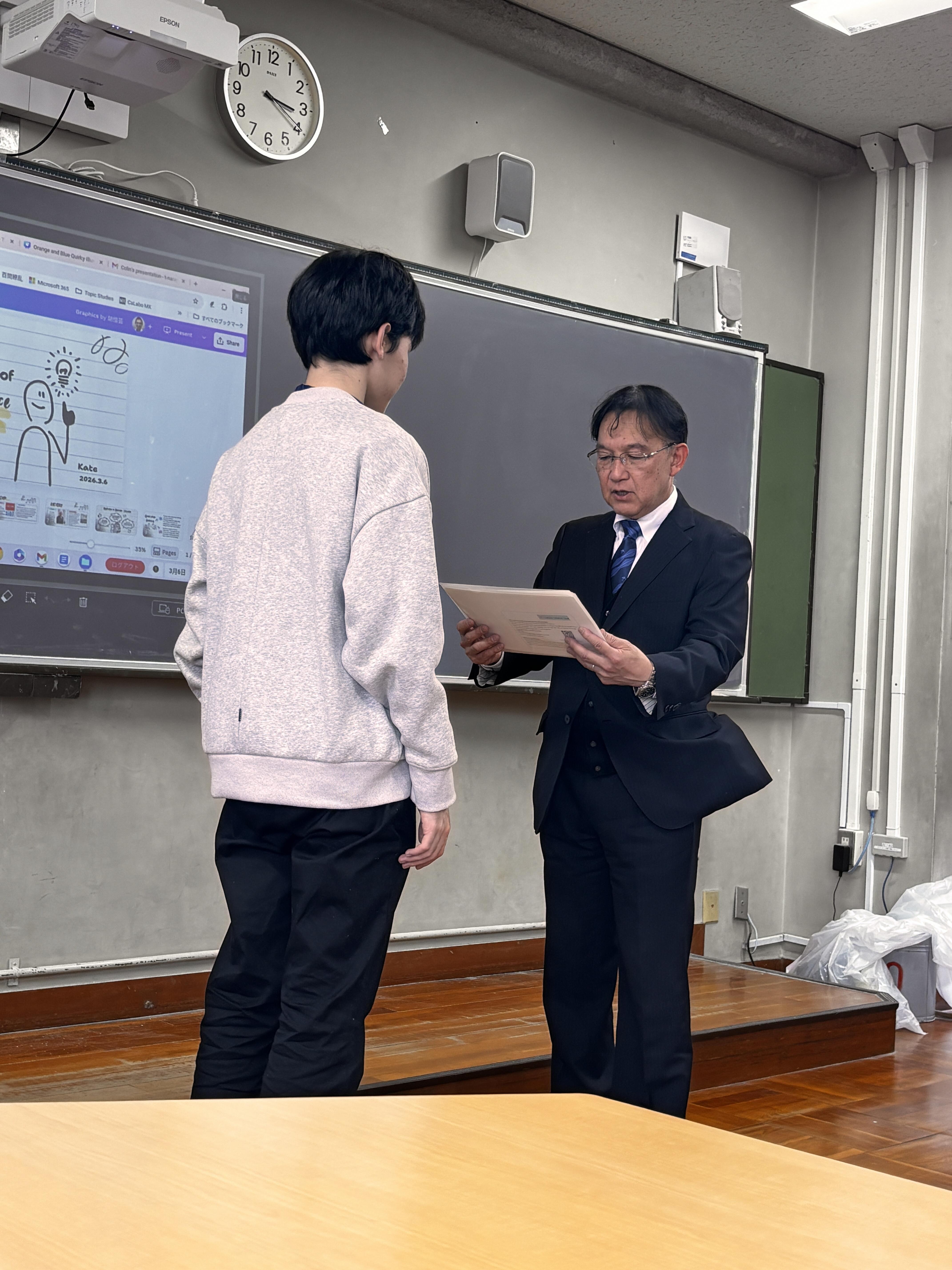 最終日の発表会では、この1週間で学んだ「量子」や「半導体」について、堂々とプレゼンをしました。準備の時間はあまりとれませんでしたが、生徒たちは素晴らしい発表をしてくれました。アンケートには「明日からはもっと積極的に英語のニュースを読み、世界に目を向けたい」という力強い決意が並びました。