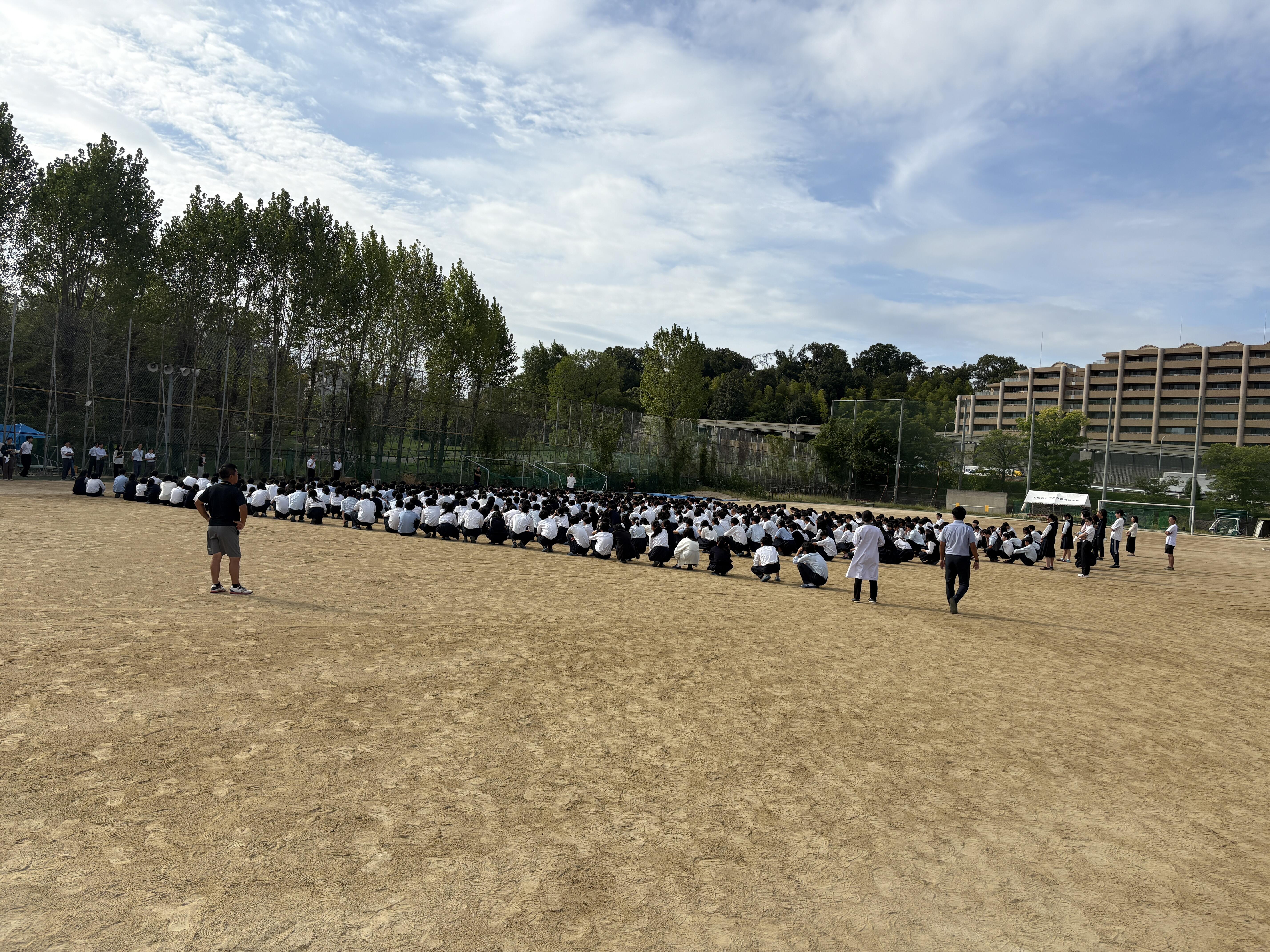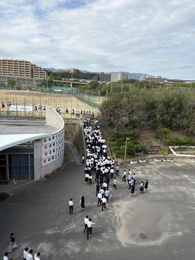 教室ごとに時差をつけてグラウンドへ避難しました。