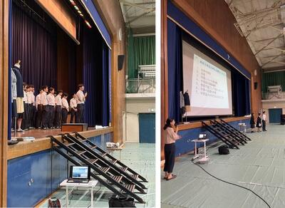 午後の前半は第1体育館で音楽祭で優秀賞を受賞した3年生の合唱から始まり、校長挨拶のあと、進路担当者による進路状況や授業の選択についての説明と進路担当者から高校3年生の生徒へのインタビュー、そして最後に生徒会の生徒による学校生活の説明を行いました。