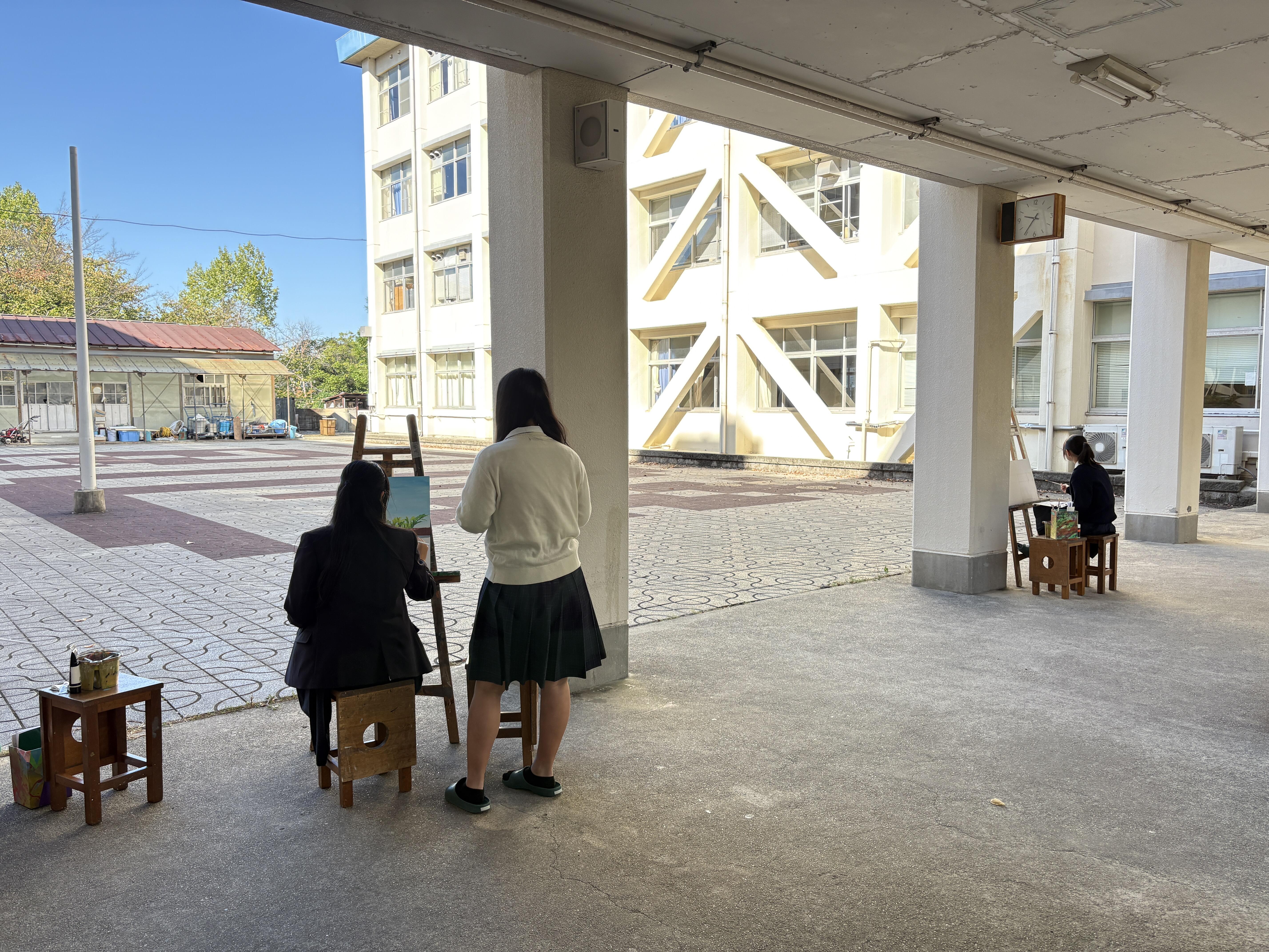 選択科目「絵画表現」の実習で、校内の風景画を描く実習を行っています。