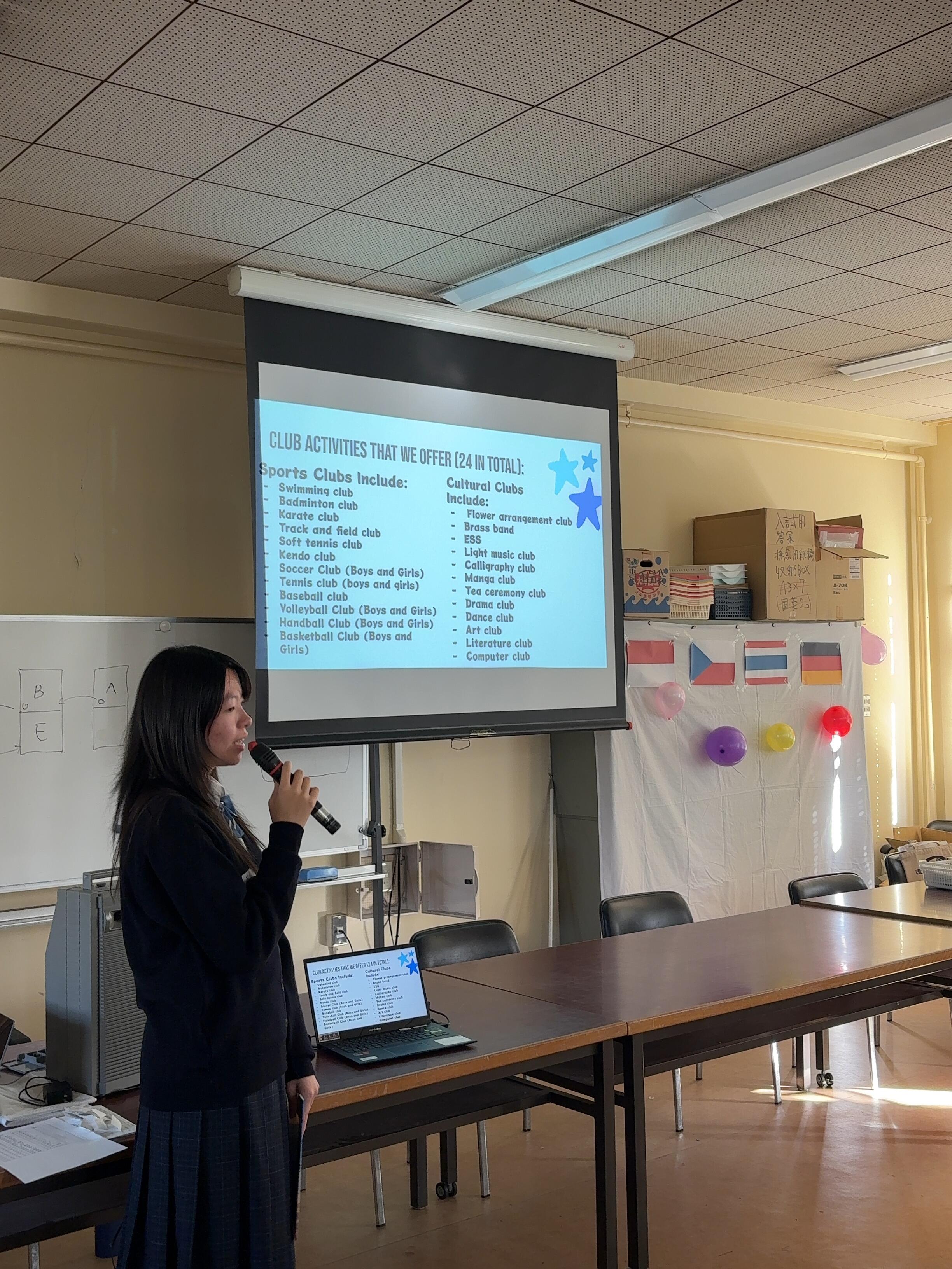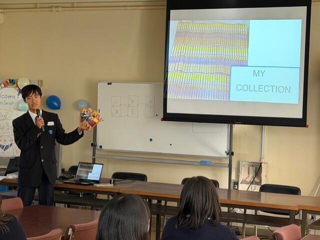 プレゼンテーションでは、日本のアニメについて、千里青雲高校についての内容を英語で話してくれました。