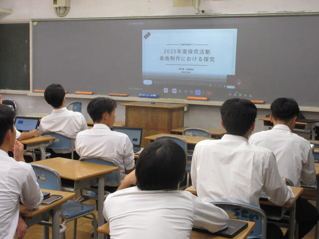 ↓ こちらは2年生のとあるHR教室。これから探究の発表を視聴。