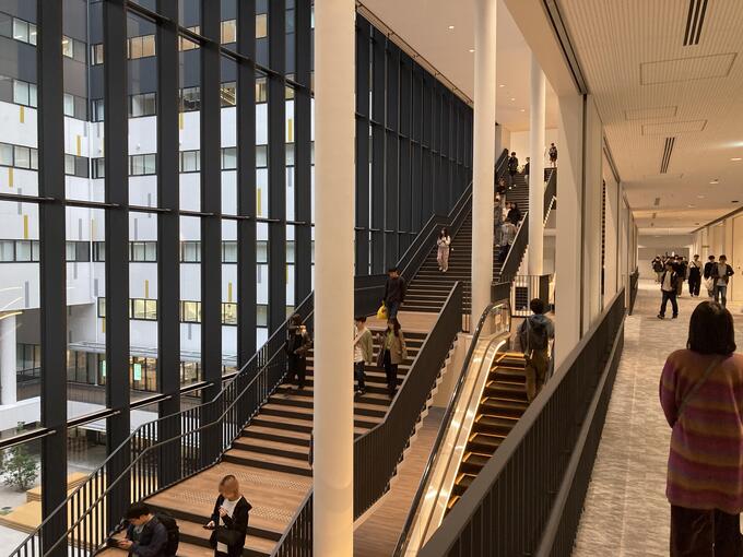 外観は巨大ビルですが、建物内では大小さまざまな教室、図書館、カフェ、フリースペースなどで楽しそうに語らい、学ぶ学生さんの姿があり、やっぱり「キャンパス」でした。なお、大阪公立大は中百舌鳥や杉本町にも大きなキャンパスを有しますが、1年生は、まずはこの森之宮キャンパスに通うそうです。