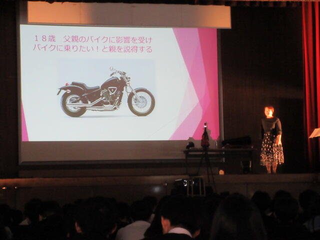 今日(10月23日)午後、人権教育の一環で伊藤真波さんをお招きして講演会を実施しました。インフルエンザの流行もあり、会場の体育館には2年生だけが入り、1・3年生はHR教室で体育館からの配信映像を見て貰っていました。