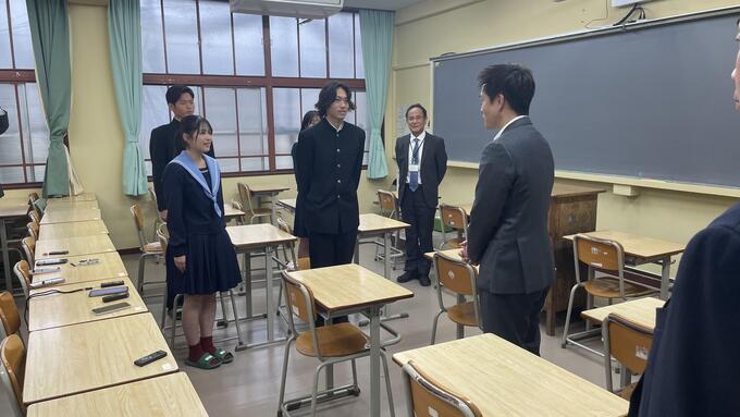 本校は現在、4年の長期に渡る工事で、外壁や窓枠などを改修してもらっています。それに加え今回、府のモデル事業として3年生のHR教室内のリニューアルも施して頂きました。壁、天井の再塗装や、床の張替えまでもして頂き、教室は一新。その様子をご覧になるため、知事が来校された次第です。