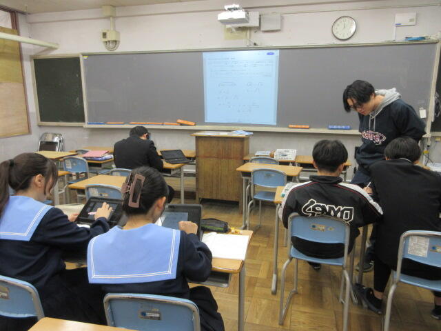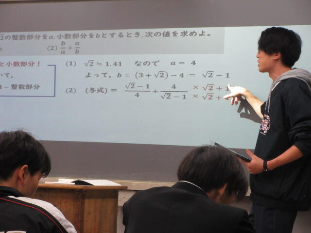 昨日(11月4日)は3年生の選択数学にお邪魔しました。理型クラスですが、数学Ⅲが不要なグループで5人での授業です。なんと贅沢な! さすが理系生徒だけに、二重根号など朝飯前。スラスラと数学の問題が解けると爽快でしょうね。