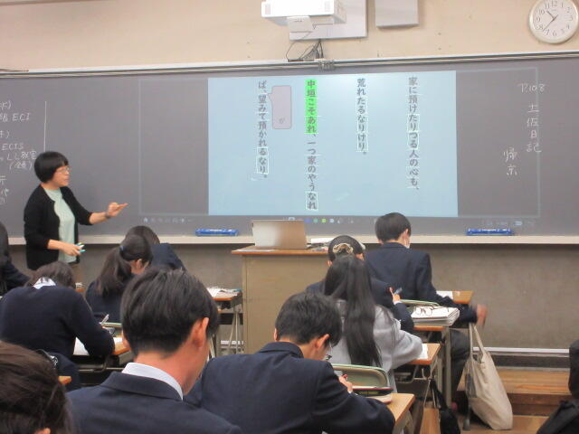 1年生が紀貫之の『土佐日記』を学んでいました。この日は徹底的に助動詞に焦点が当てられ、生徒たちも次から次へと当てられていましたが、なかなか的確に答えていました。優秀。私も見学中に当てられ「寸志」の意味を尋ねられましたが、見事に正解。優秀? ちなみに私の答えは「三千円」。