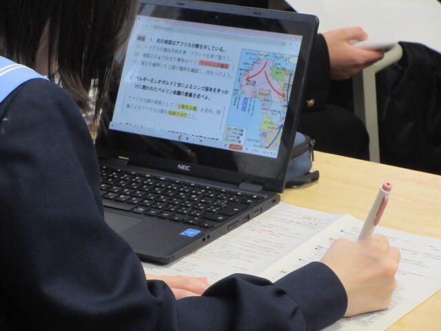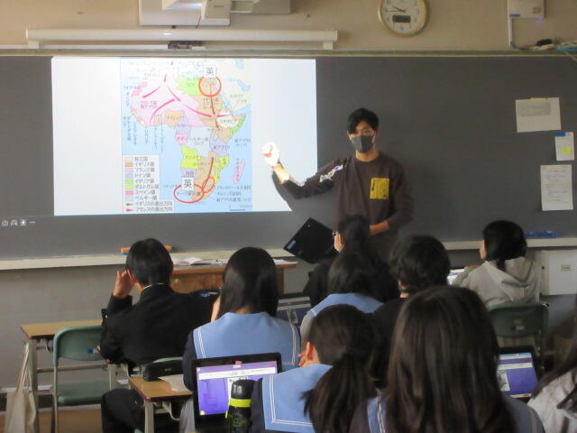 私は2年生の「歴史総合」と1年生の英語「論理・表現Ⅰ」の教室にお邪魔しました。ヨーロッパの列強各国がアフリカの植民地化を我先にと進めたのは、ベルギーがコンゴを支配したことがきっかけだったとは知りませんでした(忘れてしまっていました?)(物事をどんどん忘れていく...)。英語は「分詞」と「関係代名詞」を扱っていました。SVOCの文構造や使役動詞の使い方もポイントだったようです。1年生にとっては踏ん張りどころですね。