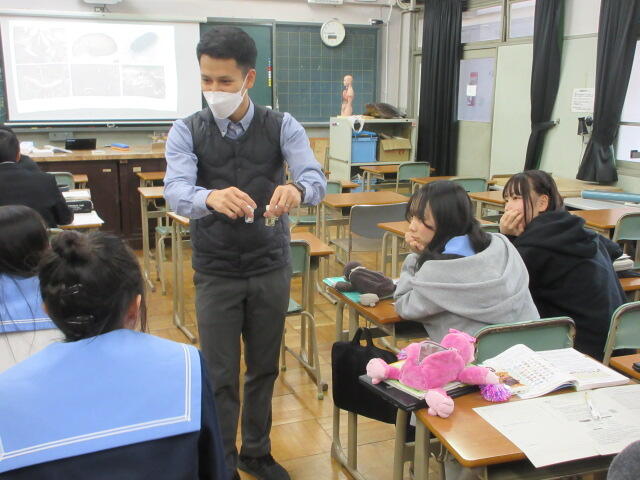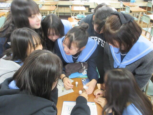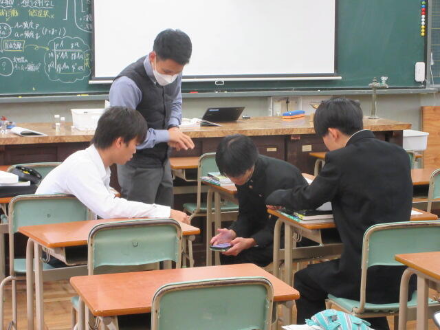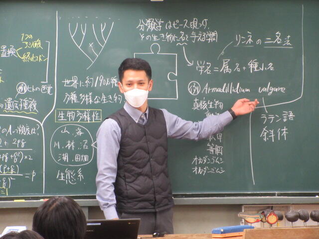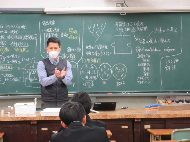 2年理型クラスの生物(選択)の授業にお邪魔しました。選択の関係でこのクラスは12人での授業です(もう一方のクラスは40人弱ですが)。