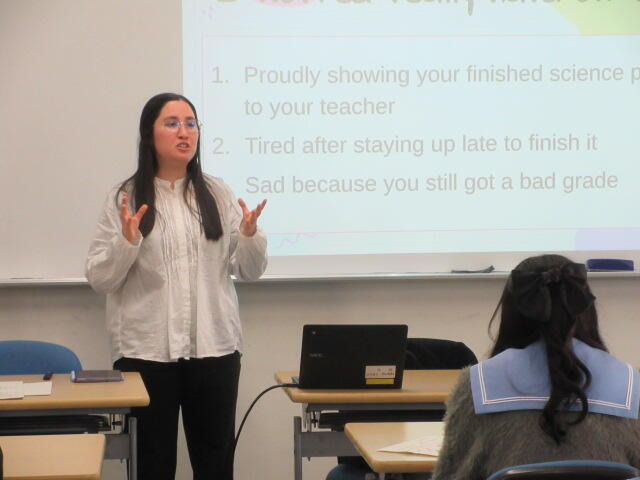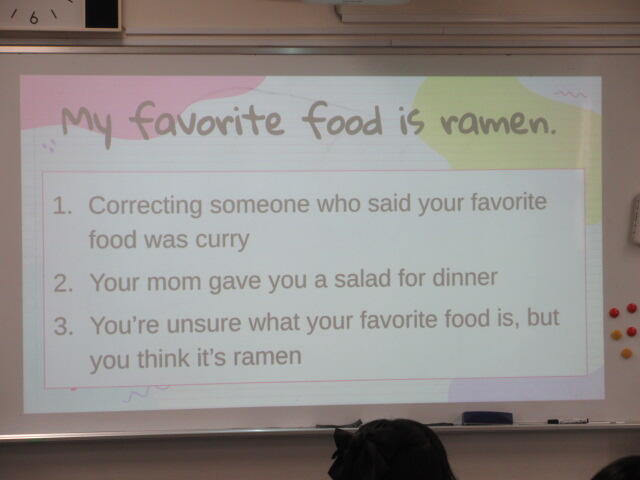 2年生の授業見学が続いています。この日はLL教室でのティームティーチング。「ラーメンが好きなんだ」を状況に応じて、感情を込めて(?)相手に伝えます。「君はカレーが好きだったよな」と言われたとき、「晩御飯に(嫌いな)サラダを出された」とき、「何が好きと問われても、自分でもはっきりしない」とき、などのシチュエーションで、どんなふうに"My favorite food is ramen!"と言うか。「ラーメンが好き」って言うだけでも中々奥深いものです。ちなみに「あなた(きみ)(おまえ)が好き」は大きな声ではっきり言って欲しい派?それともささやくように? 少なくとも笑いながらはやめて欲しい??