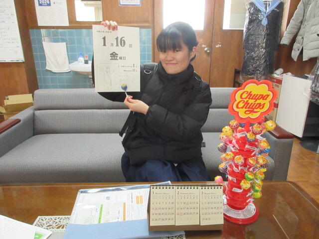 ↓ 掲載作品(上)の作者が原画を持って来室。無断使用のお詫びとお礼、そしてChupaChups進呈。