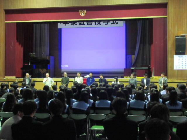 ↓ 予行を終えて、「皆勤賞」の授与。各クラスに数名ずつ、合計23名もの生徒たちが皆勤でした。