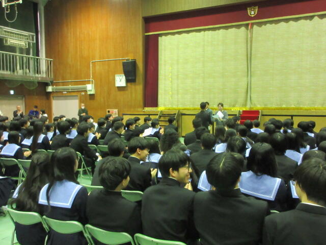 予行が無事終わって、担任の先生たちから3年生にちょっとしたプレゼント。漫才あり、懐かしの写真上映あり、そして担任一人一人から生徒たちへメッセージ。最後には修学旅行でも歌った「島人ぬ宝」の熱唱。思いのこもった「プレゼント」で、生徒たちと先生たちの深い絆が感じられました。卒業式以上に思い出に残る「予行」になったかもしれませんね。