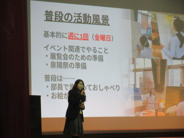 始業式の日(4月8日)の午後はクラブ紹介です。各クラブの持ち時間は2分で、カウンター時計が動く中、次から次へと舞台が展開します。40ほどあるので大忙しです。数年前のことですが、ここでのパフォーマンスが大うけして、新入部員を飛躍的に伸ばしたクラブもありました。