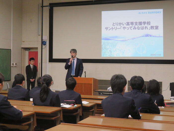 11月6日(木) 3・4限 視聴覚室にて ここ数年恒例となっている「サントリー『やってみなはれ教室』」が行われました。この教室は、2年生を対象とし、例年この時期に「サントリービジネスシステム株式会社」の社員さんにお越しいただき開催しているものです。本日も、サントリーの創業者である鳥井信治郎さんの「やってみなはれ」の精神に学びつつ、本校生徒が自身の「挑戦」についてみんなの前で発表しました。 第一部で...