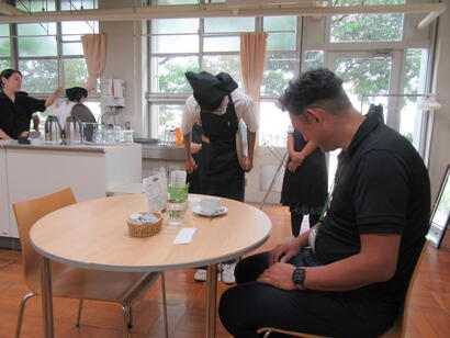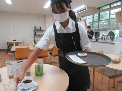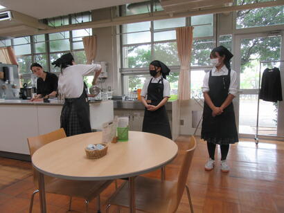 緊張のあまり「カタカタ」とカップとソーサーが音をたてます。それでも、なんとか接客しようとする姿が初々しく、また清々しかったです。これから2年半、喫茶販売の授業を継続していきますが、是非この気持ちを忘れずに頑張ってほしいと思います。