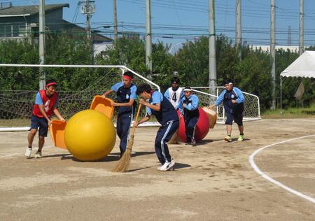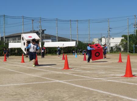 サイコロコーンリレー。巨大サイコロを担ぎながらリレーします。スタートラインでサイコロを投げ、出た目に合わせて走る距離が決まります。出た目が大きければ遠いところのコーンを回らなくてはなりません。気力・体力・時の運。どの目が出るのか、また巨大サイコロをどう運ぶのか、このあたりが見どころです。