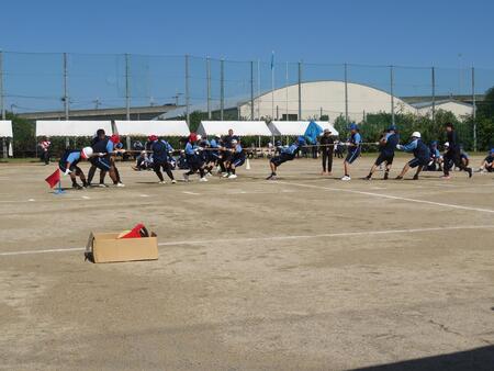 1年生学年種目(「旗をあげろ!」)は、三方向に延びた綱を三チームがそれぞれ綱引きします。綱の端っこの人が少し離れたところのポールに立ててある旗をゲットしたら勝ちという競技です。力を合わせて綱を引っ張る姿と、旗に手が届きそうで届かないハラハラ感をお楽しみください。