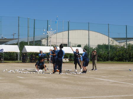 玉入れ。いくつもの玉を抱えていっぺんに投げる人、一つひとつを慎重に投げる人、どの投げ方がより多くかごに入れることができるでしょうか。それぞれの投げ方にも注目です。