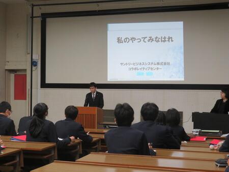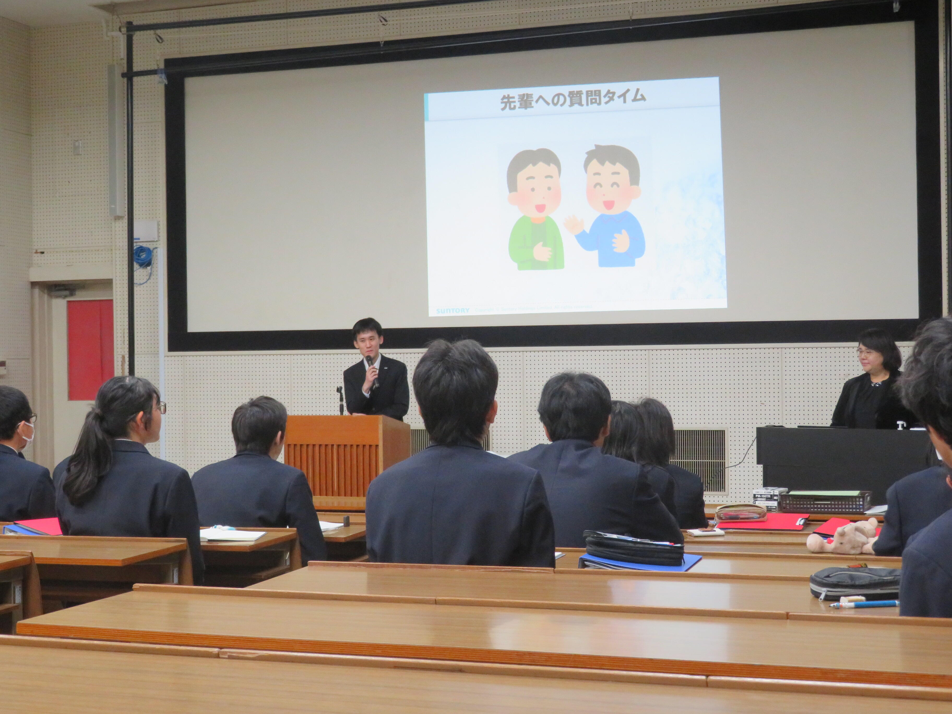 第一部では「サントリービジネスシステム株式会社」に就職した本校の卒業生のお話を聞きました。今年度は、この春本校を卒業し「サントリービジネスシステム株式会社」に就職した10期生の先輩が、