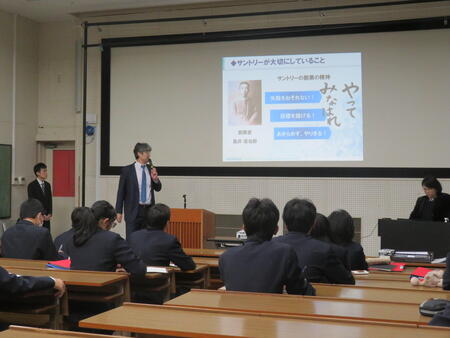 ここ数年恒例となっている「サントリー『やってみなはれ教室』」が行われました。この教室は、2年生を対象とし、例年この時期に「サントリービジネスシステム株式会社」の社員さんにお越しいただき開催しているものです。本日も、サントリーの創業者である鳥井信治郎さんの「やってみなはれ」の精神に学びつつ、本校生徒が自身の「挑戦」についてみんなの前で発表しました。