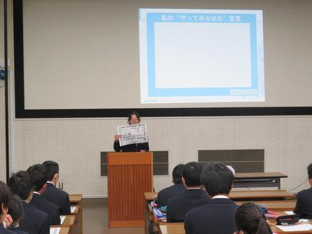 また第二部では、生徒たちがこれからの学校生活や人生において「チャレンジすること、がんばること」を「私の"やってみなはれ"宣言」として書き出し、みんなの前で発表しました。「チャレンジすること、がんばること」だけでなく、そう考えた理由についても個々の生徒から説明がありました。