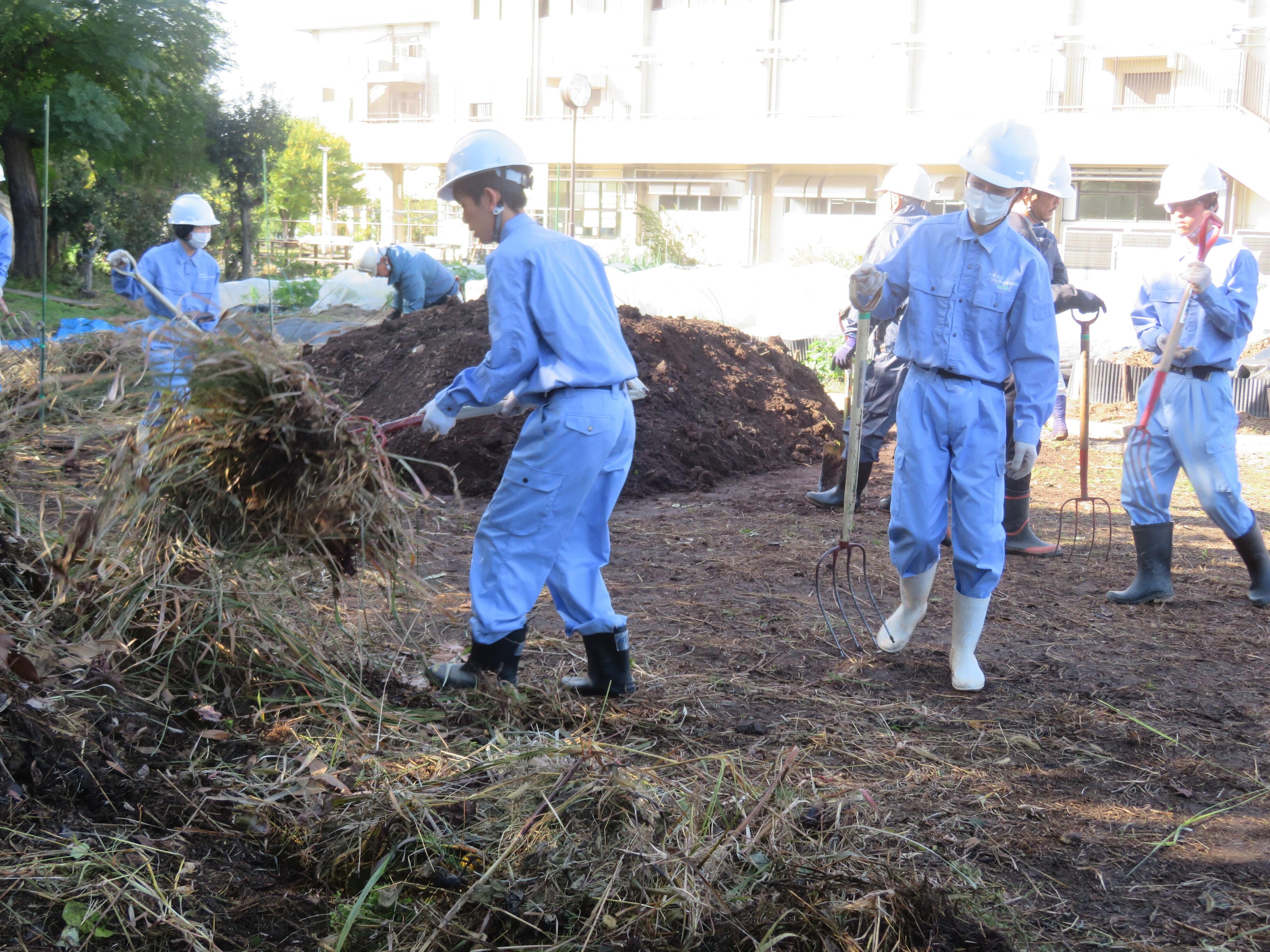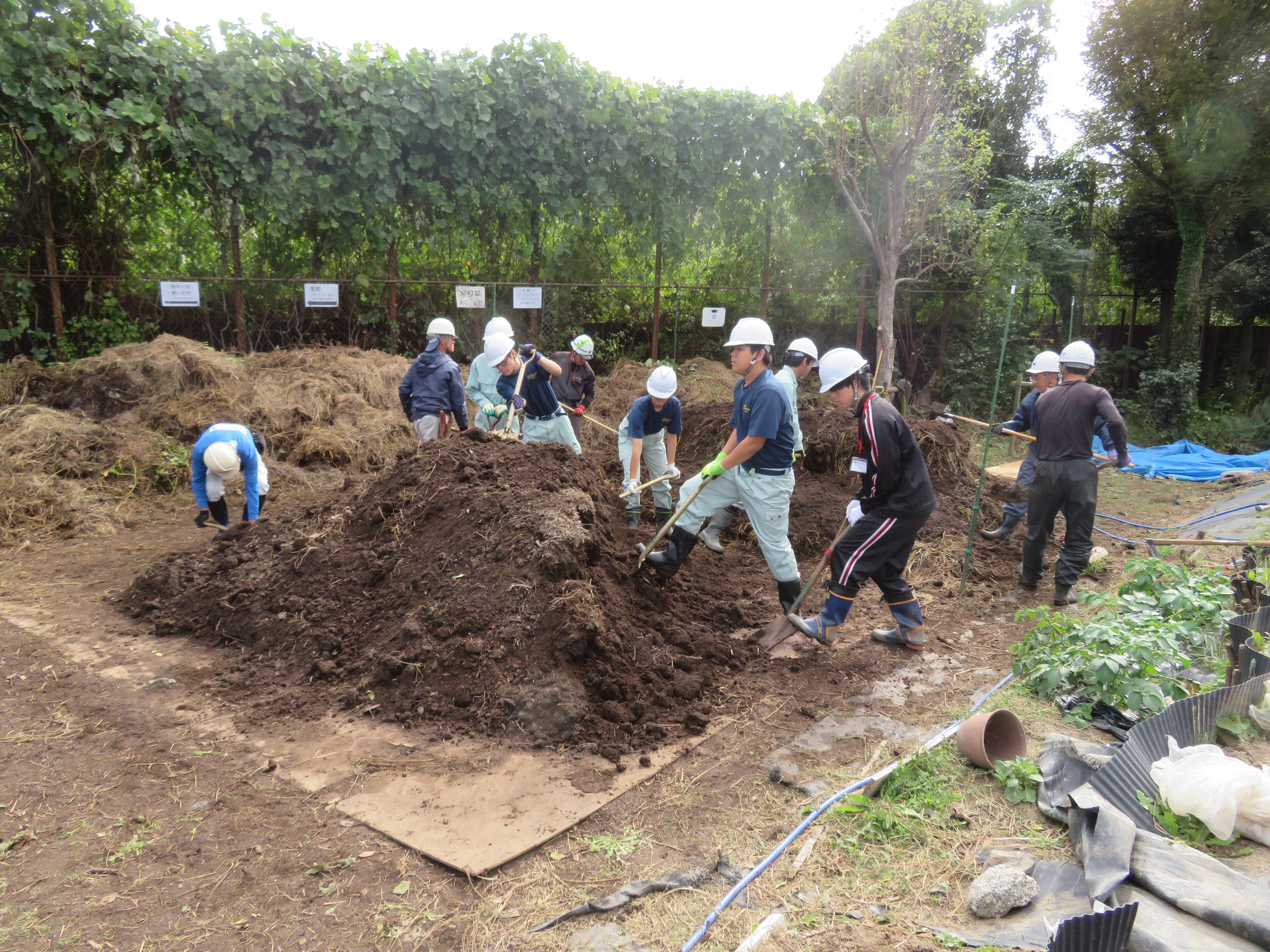 本校の農園は、開校当時テニスコートの跡地に設けられたもので、かちかちの地面を耕しながら、石をよけるといった土づくりを一から行って整備されたと聞いています。以来12年あまりをかけ、生徒と教員がこつこつと土づくりに取り組んできました。これまで、服部緑地乗馬センターからいただいた厩肥や校舎周りの草木を焼いて作った草木灰(2024.12.17校長ブログ参照:ここをクリック)、そして本日と同様の作業でつくってきた堆肥などをすきこんできました。そうして今では自慢の土が「鳥飼なす」をはじめとした多くの野菜を育てています。