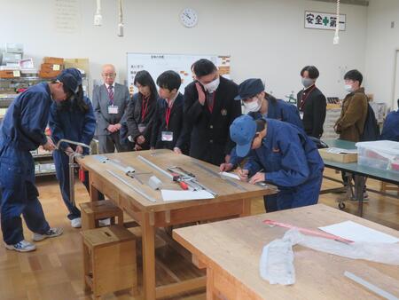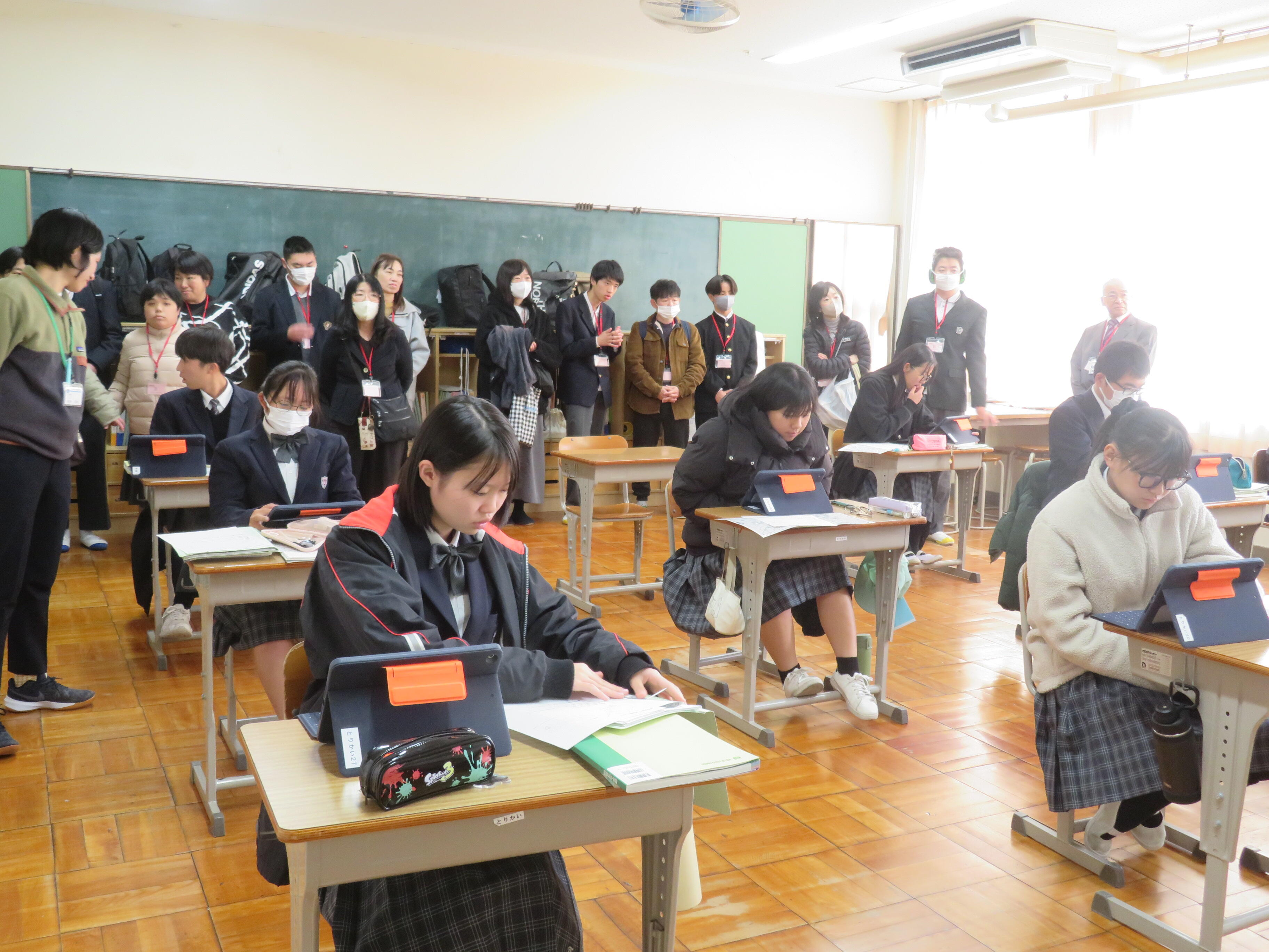 8月に行ったオープンスクールでは、学科と職業共通の授業を体験・見学いただいたため、今回は教科を中心とした学習の様子を見ていただきました。本日は、中学生・保護者・教員合わせて54人の参加がありました。