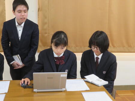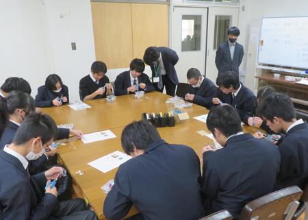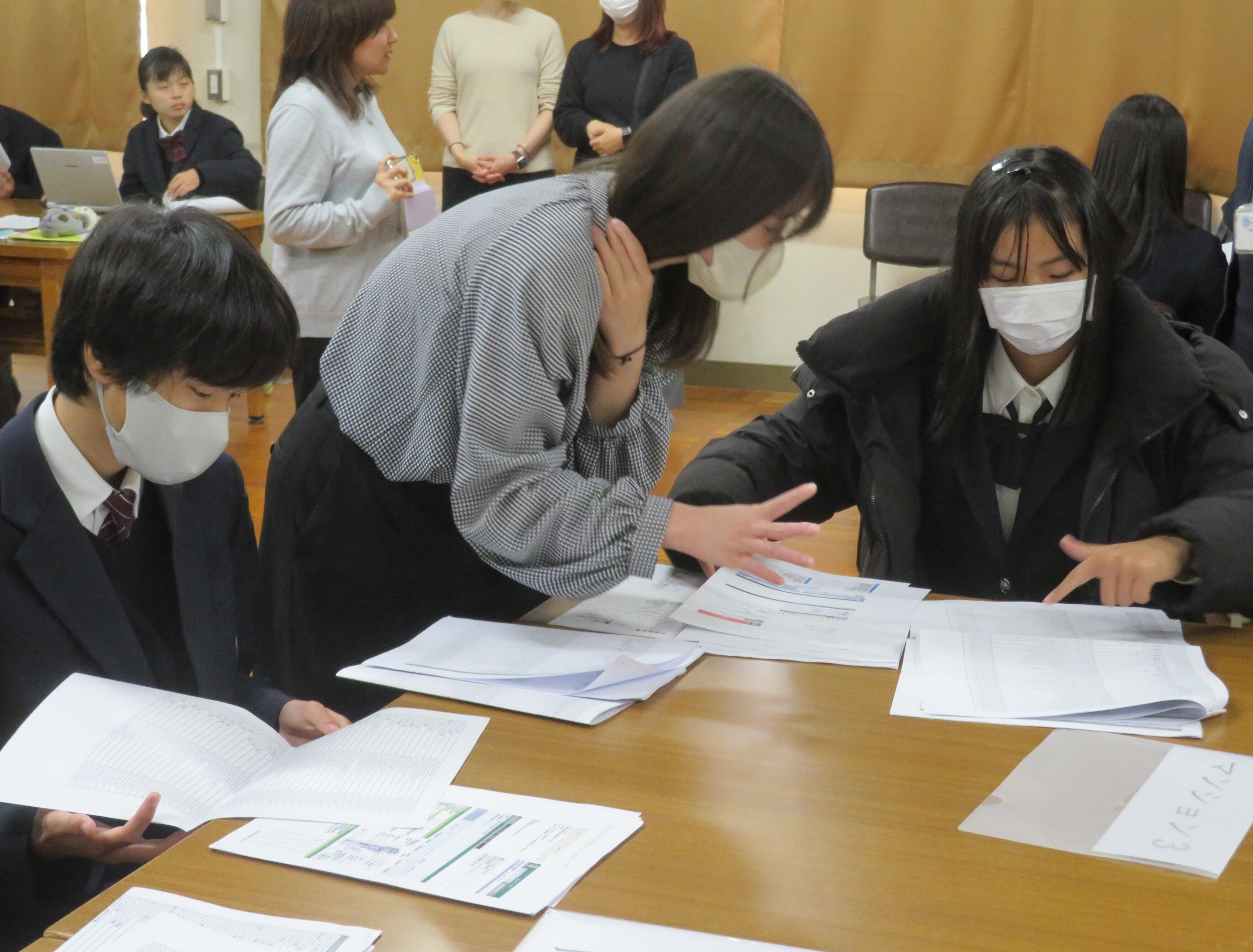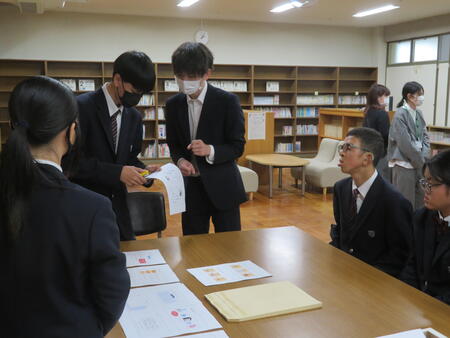 グローバルコミュニティ株式会社から吉田様をはじめ5人の社員の皆さんにお越しいただき、1年生の生徒が、作業を通じて基本的なビジネスマナーを学ぶ進路学習を行いました。