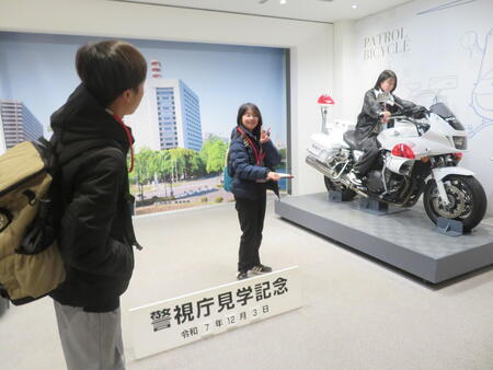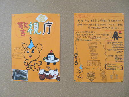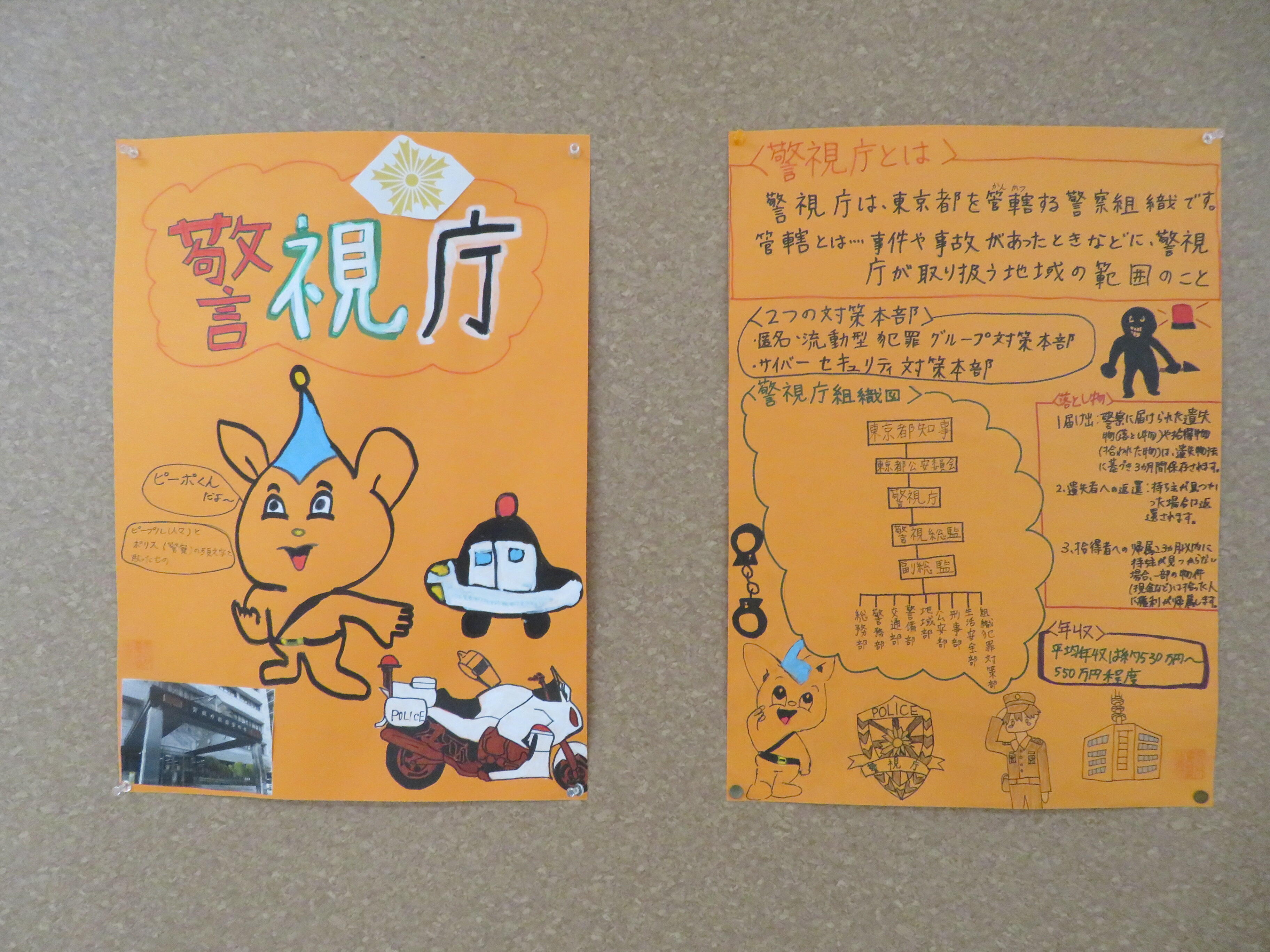 二つめの訪問先は「警視庁」。ピーポくんが出迎えてくれました。警視庁の歴史や防災について、クイズ形式で研修を深めました。また、110番の受理と指令をする「通信指令センター」は実際の110番通報を受理しているところをまのあたりにし、緊迫した感じが伝わってきました。当然ですが撮影禁止の場所がほとんどで、唯一白バイの展示のところだけが撮影可となっていました。(写真が少ないので、事前学習で調べて作ったポスターをご覧ください!素晴らしい出来栄えです。)